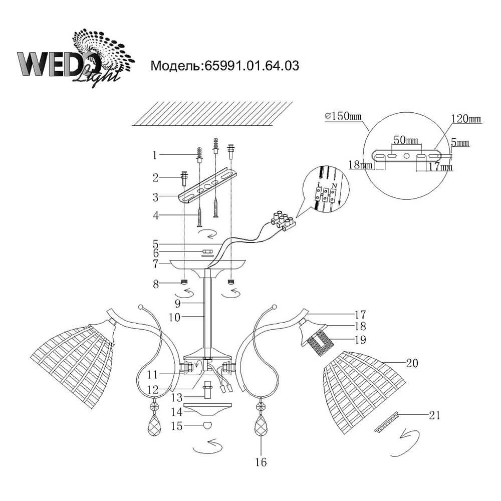 Производитель светильника рекомендует для устройства 3 лампы накаливания с цоколем E27 и мощностью 60 W, что позволит осветить помещение площадью 10 кв.м. Габариты изделия: высота – 300 мм, диаметр – 610 мм.