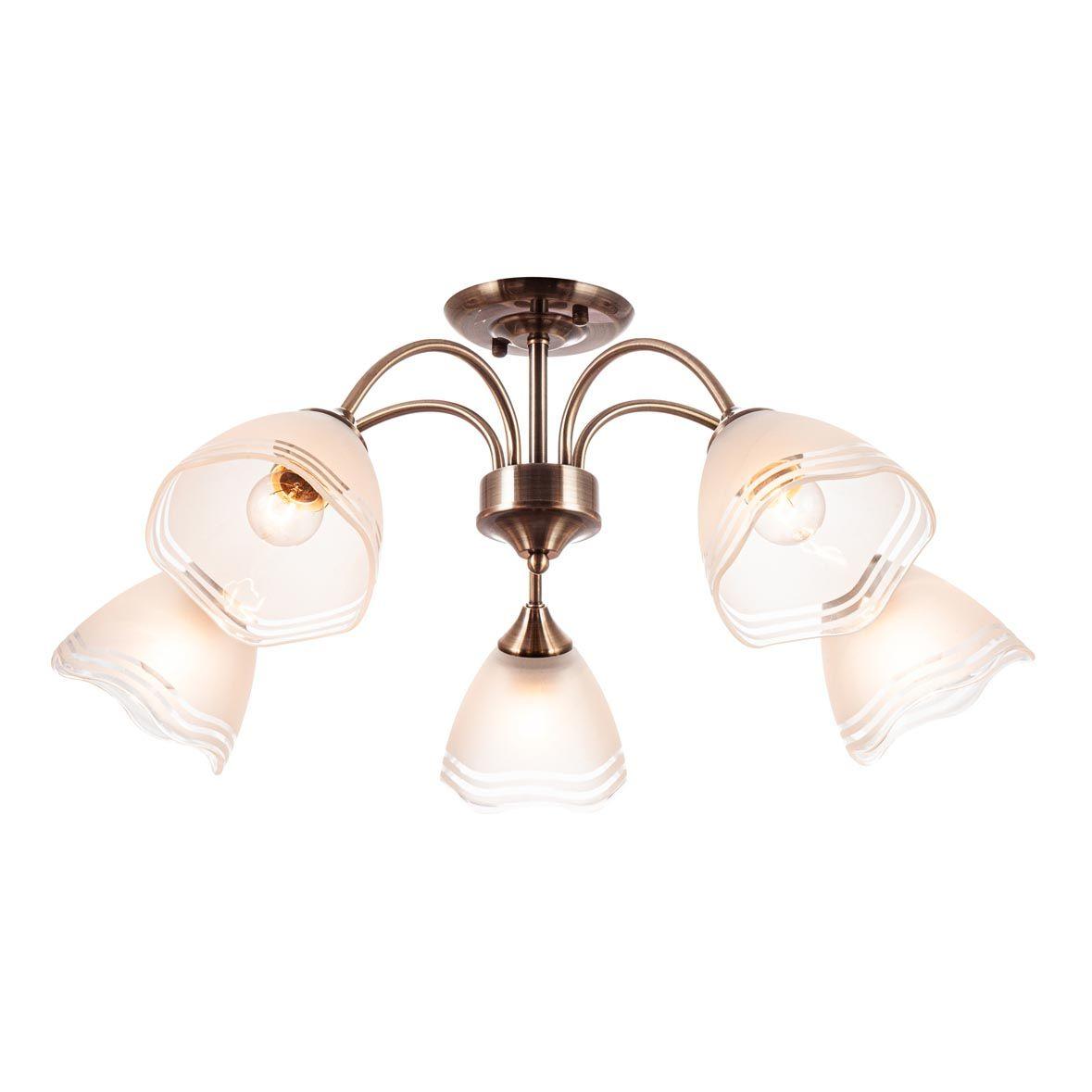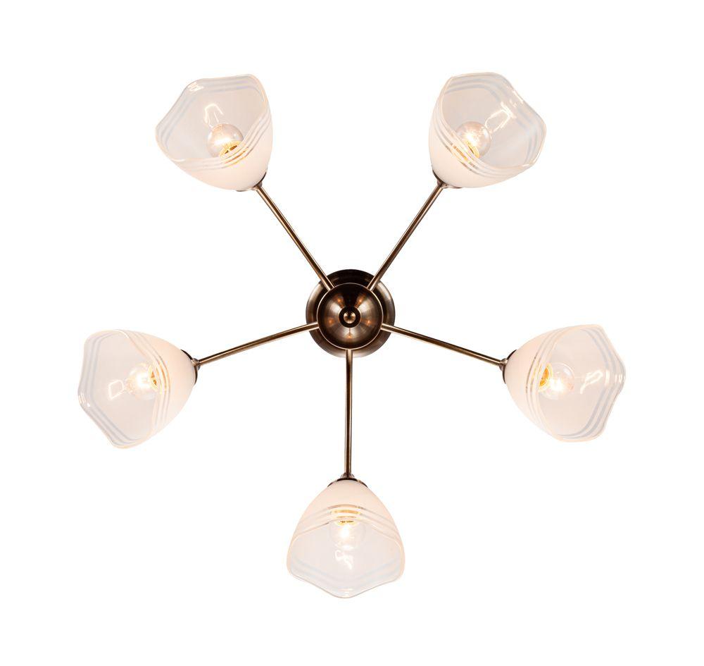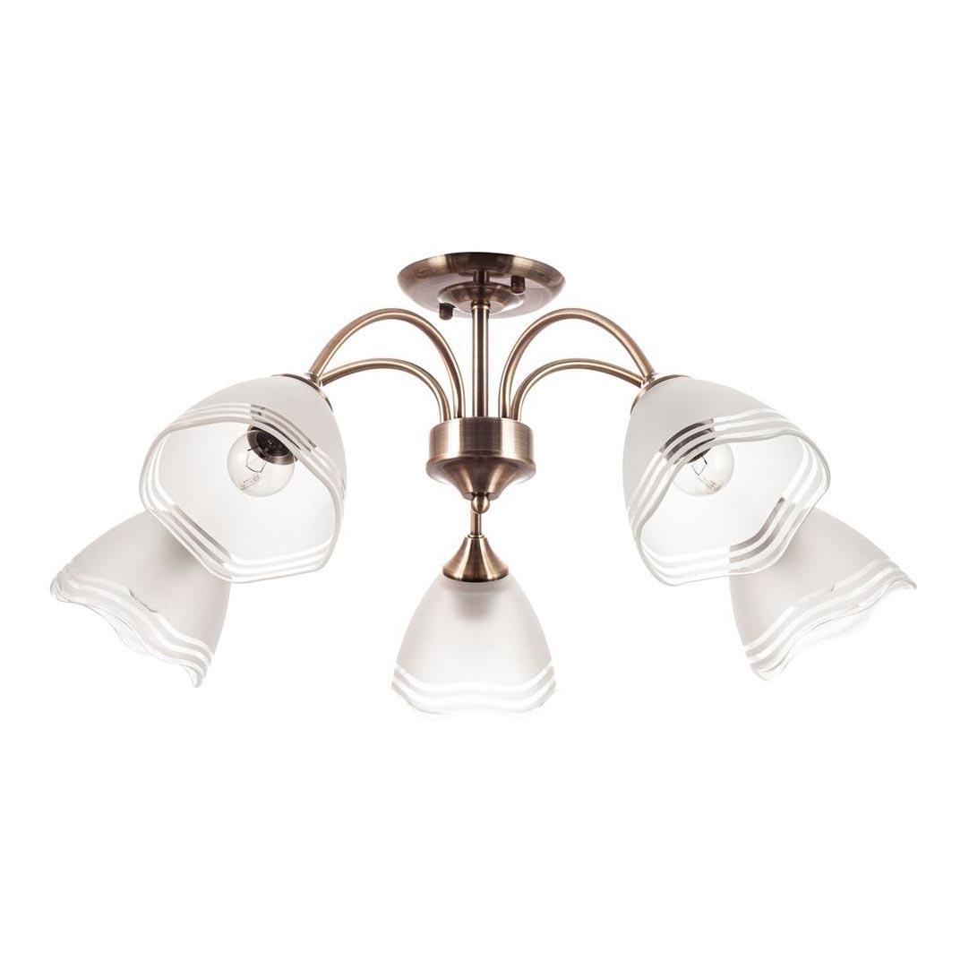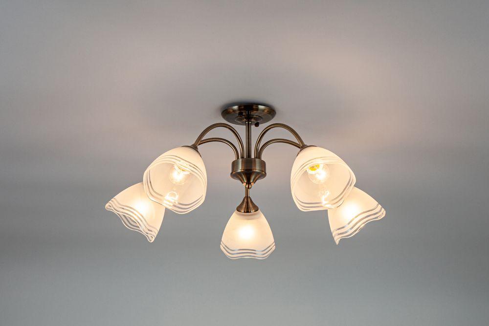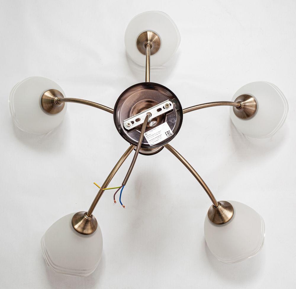 Производитель светильника рекомендует для устройства 5 ламп накаливания с цоколем E27 и мощностью 60 W, что позволит осветить помещение площадью 16,7 кв.м. Габариты изделия: высота – 290 мм, диаметр – 580 мм.