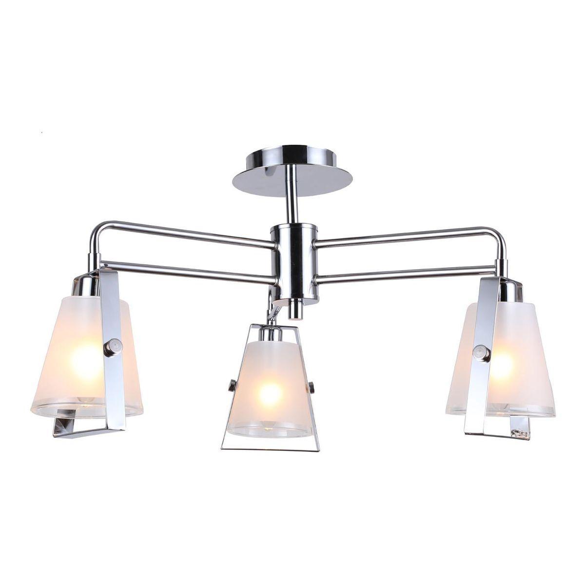 Производитель светильника рекомендует для устройства 3 лампы накаливания с цоколем E14 и мощностью 40 W, что позволит осветить помещение площадью 6,7 кв.м. Габариты изделия: высота – 300 мм, диаметр – 560 мм.