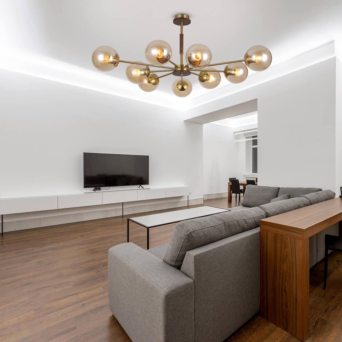 Производитель светильника рекомендует для устройства 9 ламп накаливания с цоколем E14 и мощностью 40 W, что позволит осветить помещение площадью 20 кв.м. Габариты изделия: высота – 350 мм, диаметр – 985 мм.
