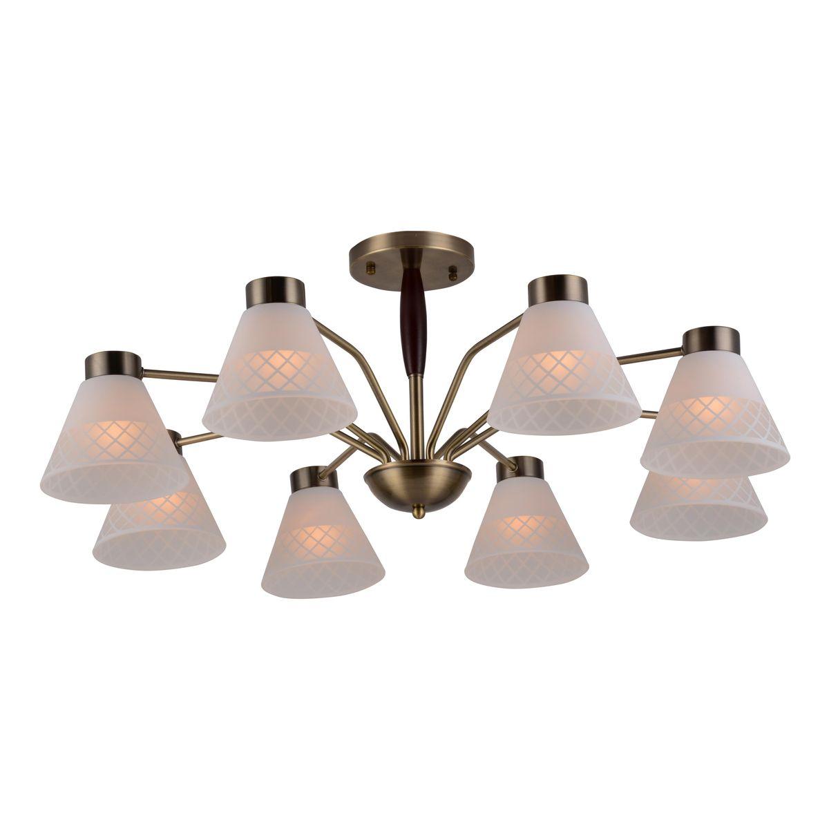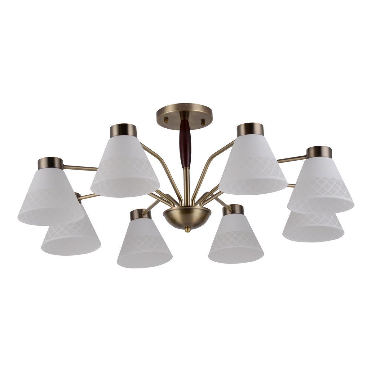 Производитель светильника рекомендует для устройства 8 ламп накаливания с цоколем E27 и мощностью 40 W, что позволит осветить помещение площадью 17,8 кв.м. Габариты изделия: высота – 350 мм, диаметр – 830 мм.