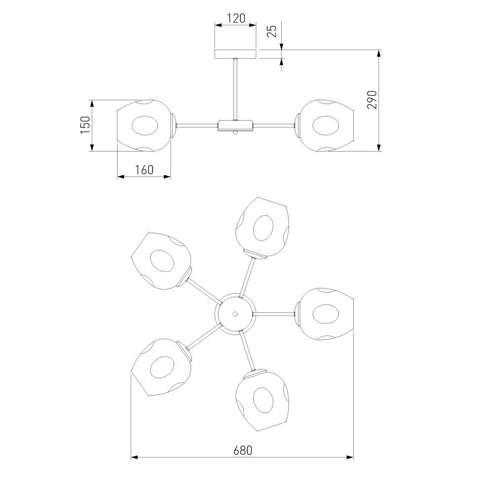 Производитель светильника рекомендует для устройства 5 ламп накаливания с цоколем E27 и мощностью 40 W, что позволит осветить помещение площадью 11,1 кв.м. Габариты изделия: высота – 290 мм, диаметр – 680 мм.