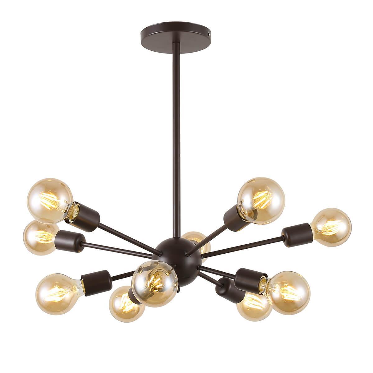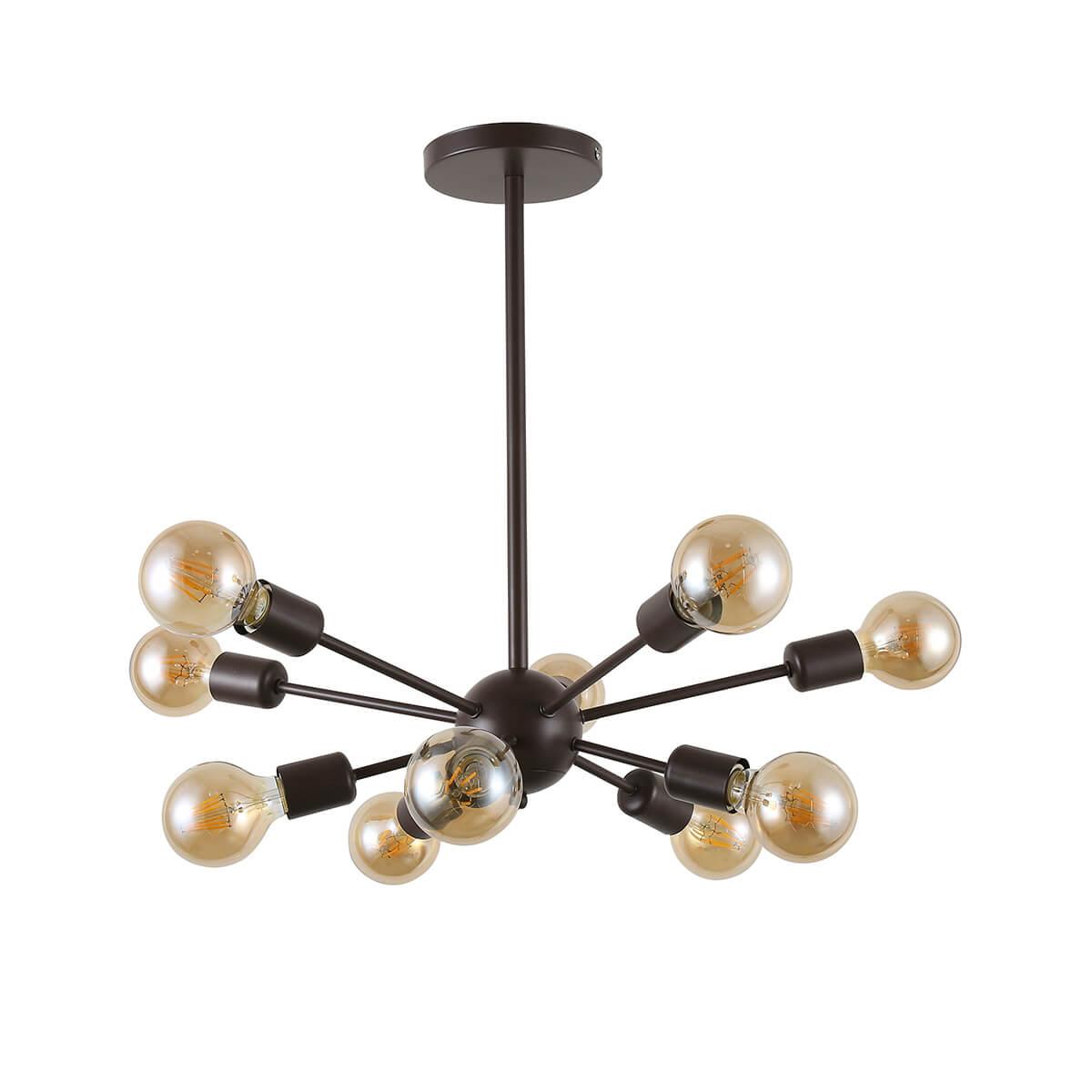 Производитель светильника рекомендует для устройства 10 ламп накаливания с цоколем E27 и мощностью 40 W, что позволит осветить помещение площадью 22,2 кв.м. Габариты изделия: высота – 590 мм, диаметр – мм.