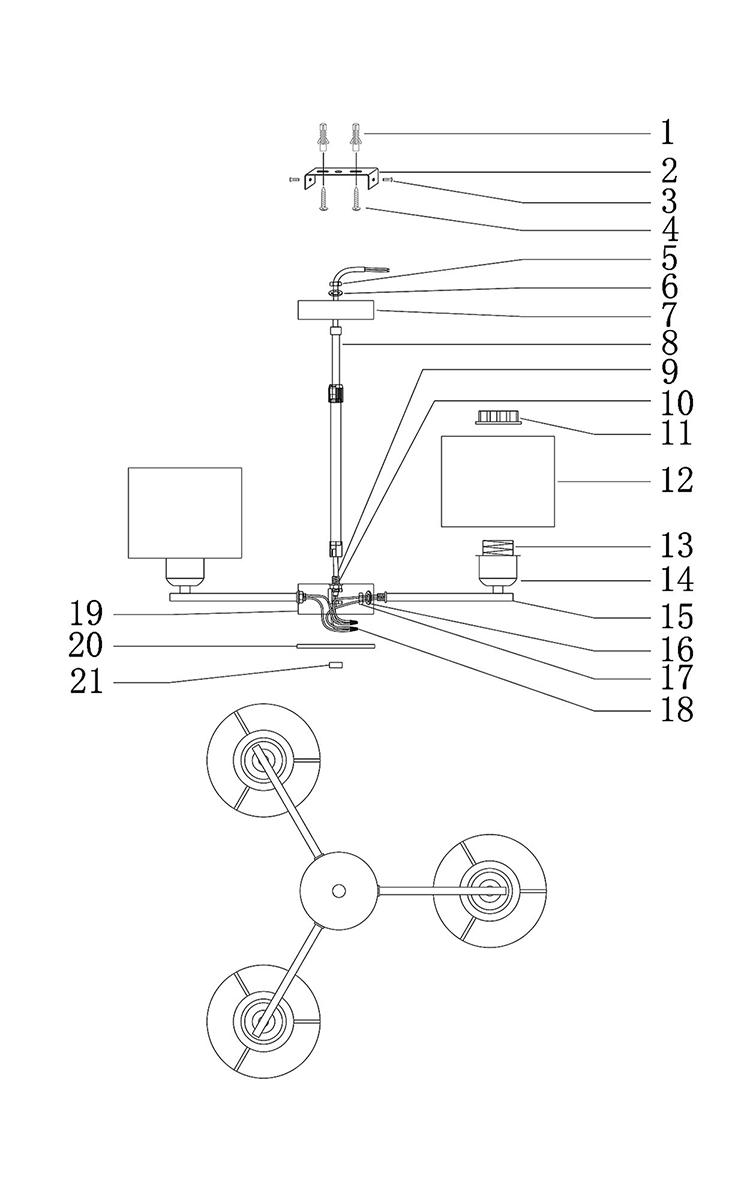 Производитель светильника рекомендует для устройства 3 лампы накаливания с цоколем E14 и мощностью 60 W, что позволит осветить помещение площадью 15 кв.м. Габариты изделия: высота – 450 мм, диаметр – 550 мм.