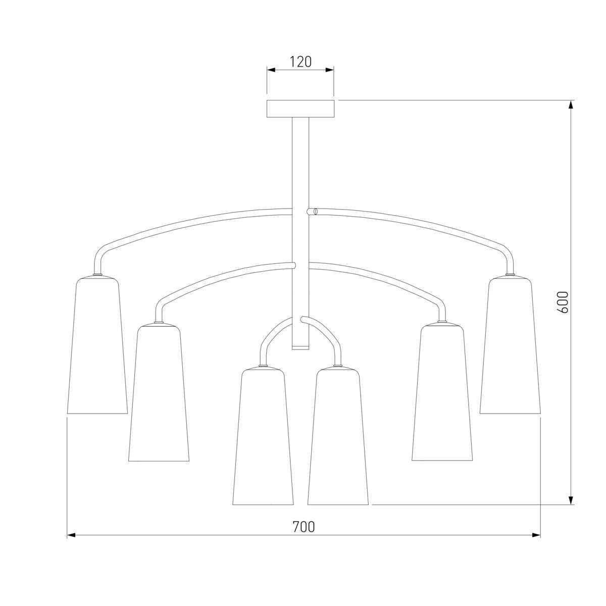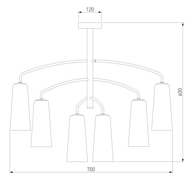 Производитель светильника рекомендует для устройства 6 ламп накаливания с цоколем E14 и мощностью 60 W, что позволит осветить помещение площадью 12 кв.м. Габариты изделия: высота – 600 мм, диаметр – 700 мм.
