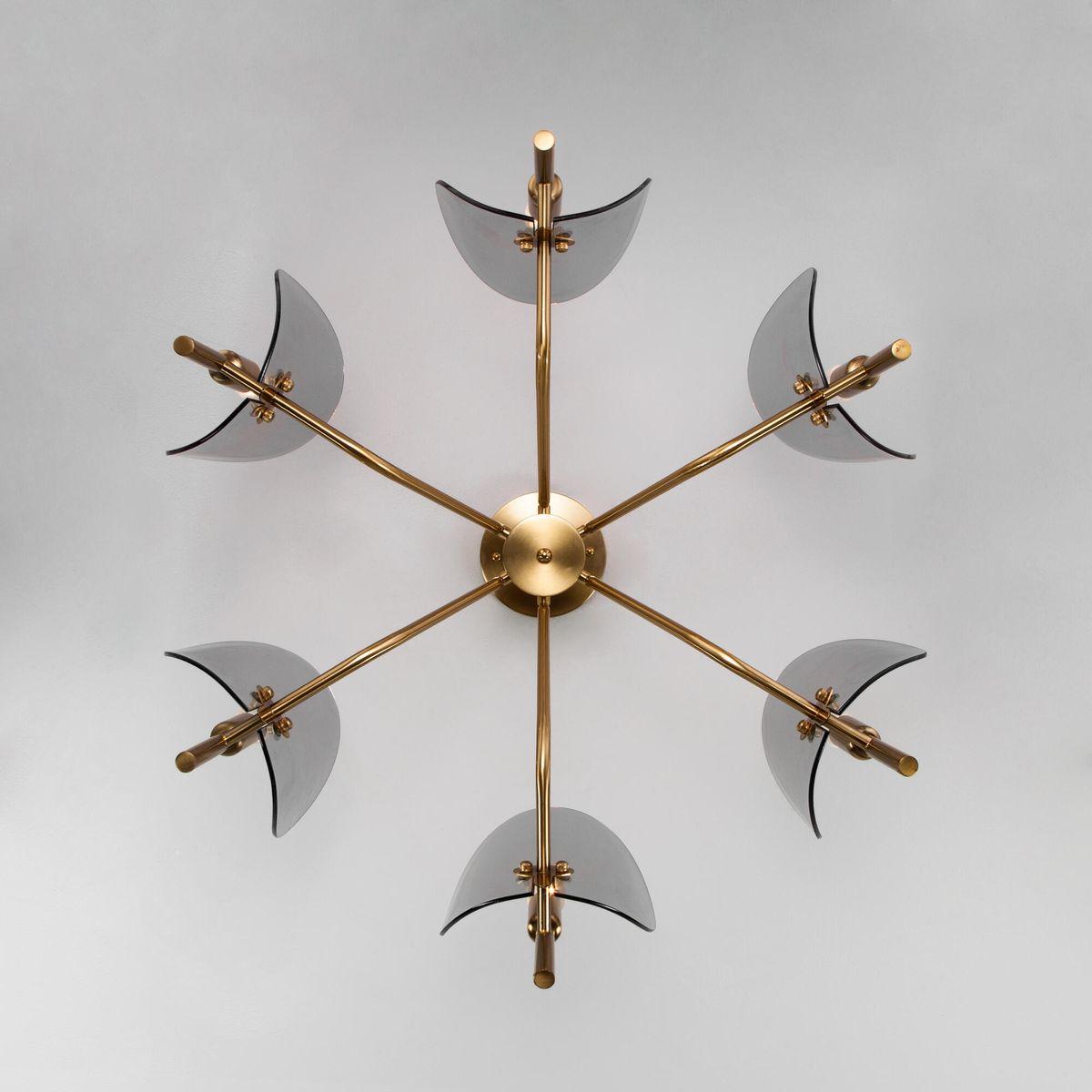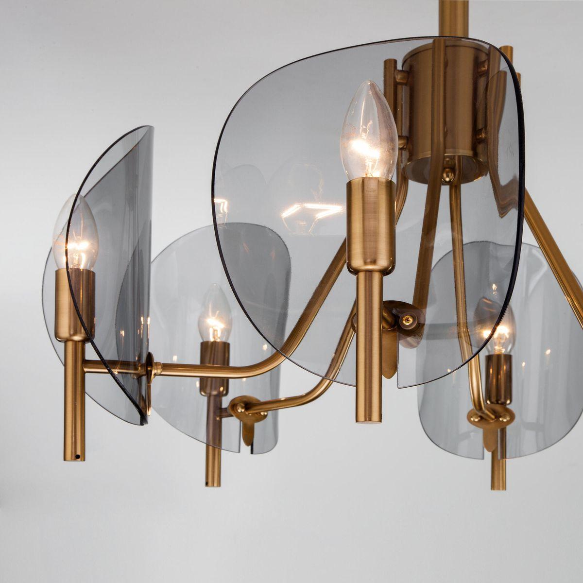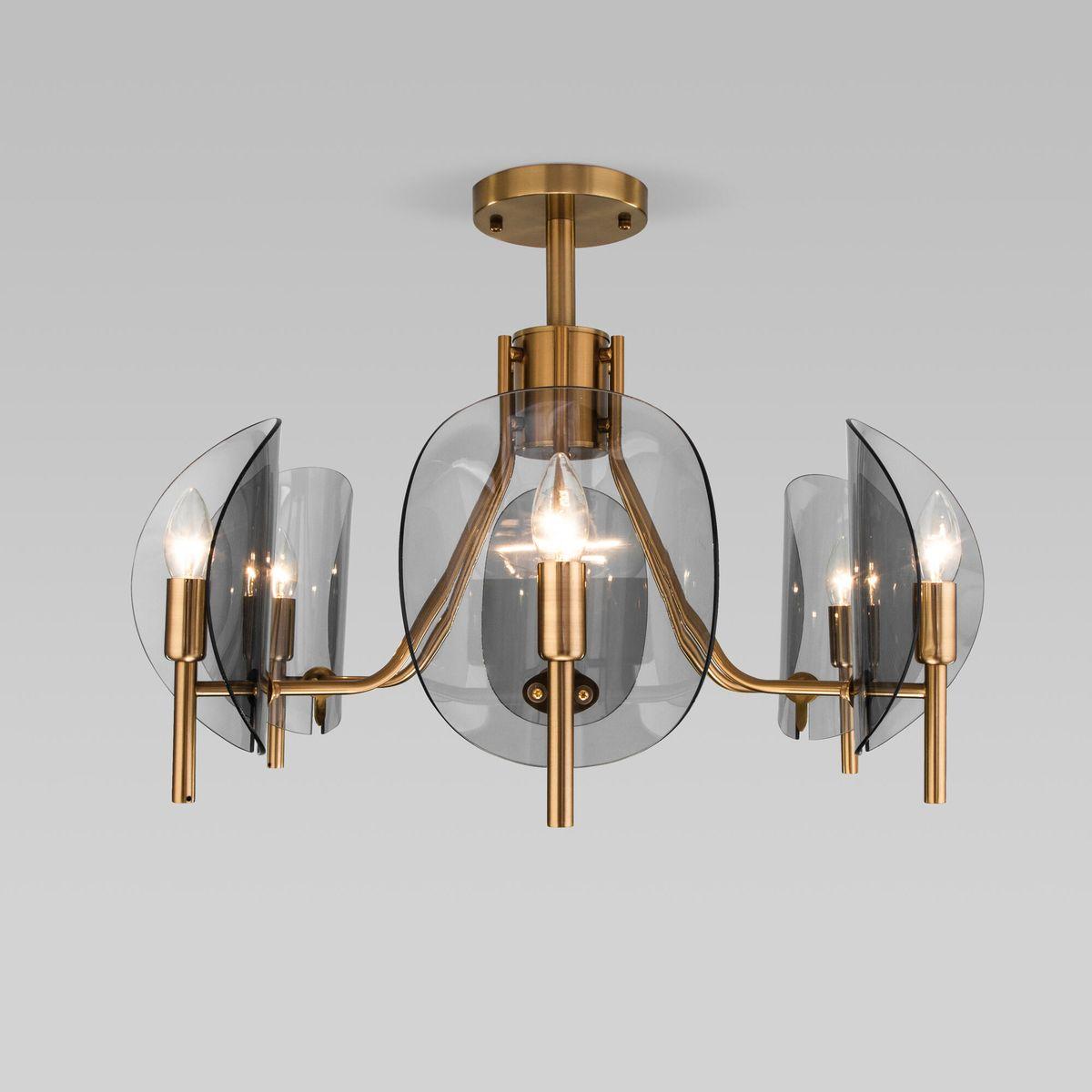 Потолочная люстра Eurosvet Rocco 60135/6 латунь от Китайского бренда из коллекции Rocco будет удачно смотреться в кухне в стиле кантри. Светильник выполнен из стекла с плафонами в форме дымчатого цвета.