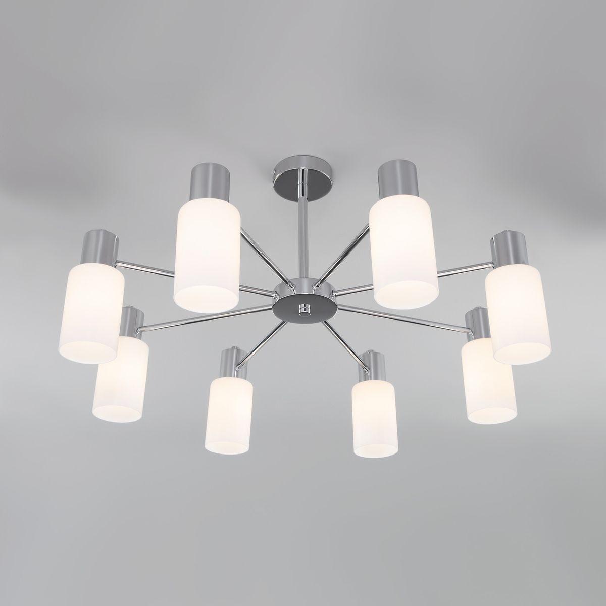 Потолочная люстра Eurosvet Vegga 70160/8 хром от Китайского бренда из коллекции Vegga будет удачно смотреться в спальни в минималистическом стиле. Светильник выполнен из стекла с плафонами в форме белого цвета.