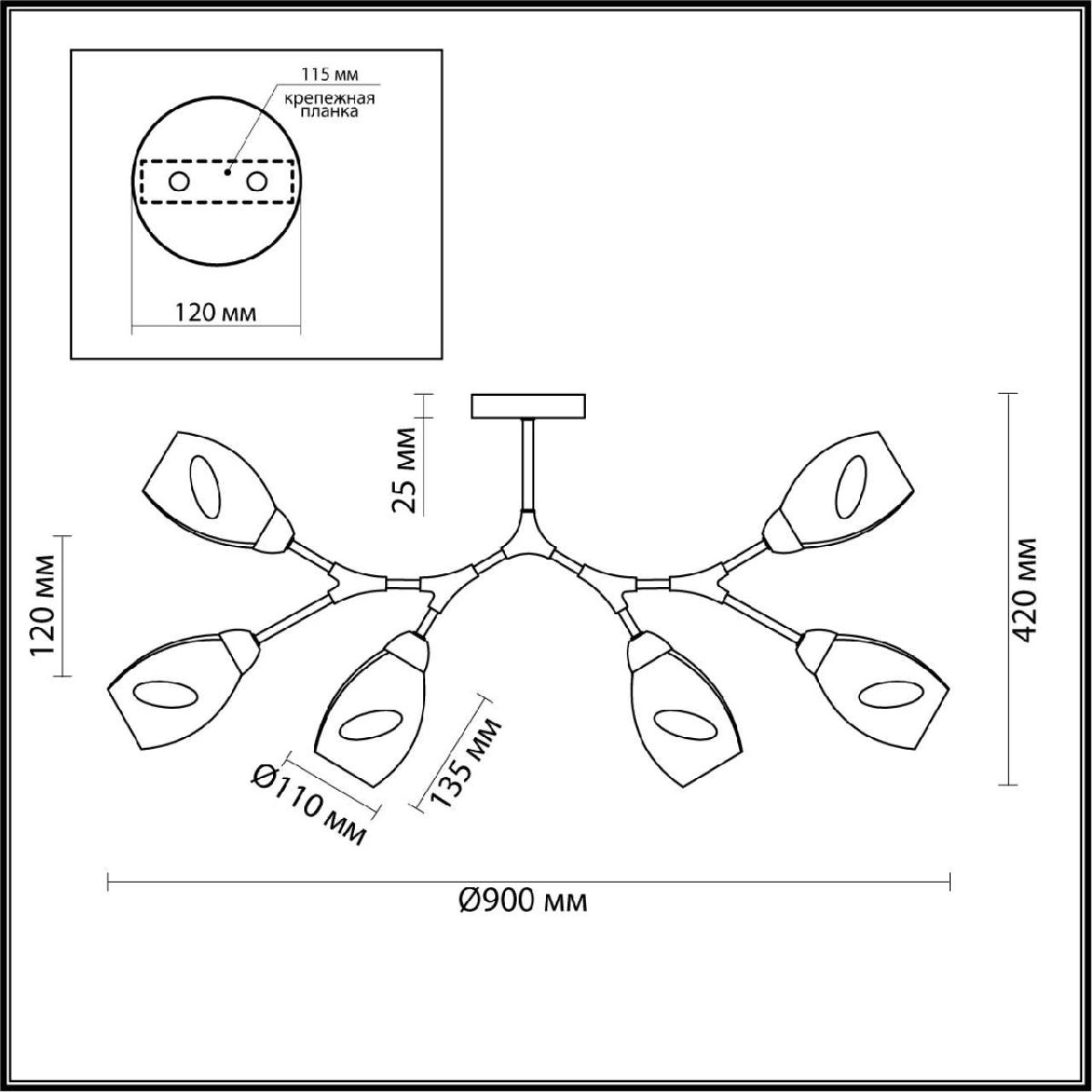 Производитель светильника рекомендует для устройства 6 ламп накаливания с цоколем E14 и мощностью 40 W, что позволит осветить помещение площадью 12 кв.м. Габариты изделия: высота – 420 мм, диаметр – мм.