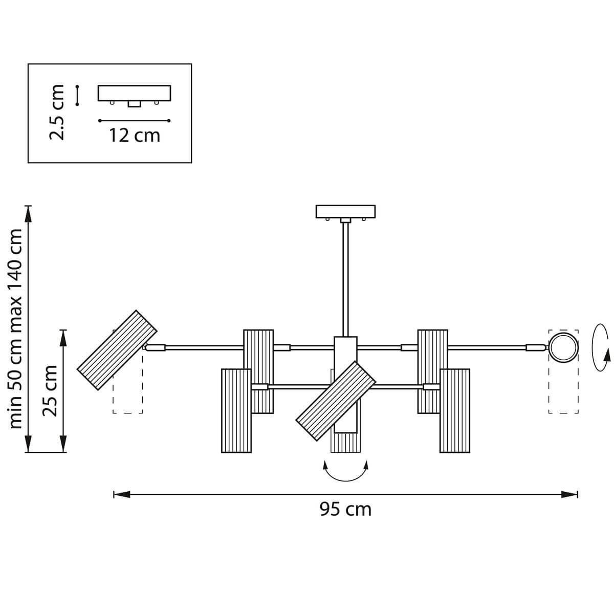 Производитель светильника рекомендует для устройства 12 галогеновых ламп с цоколем GU10 и мощностью 28 W, что позволит осветить помещение площадью кв.м. Габариты изделия: высота – 250 мм, диаметр – 950 мм.