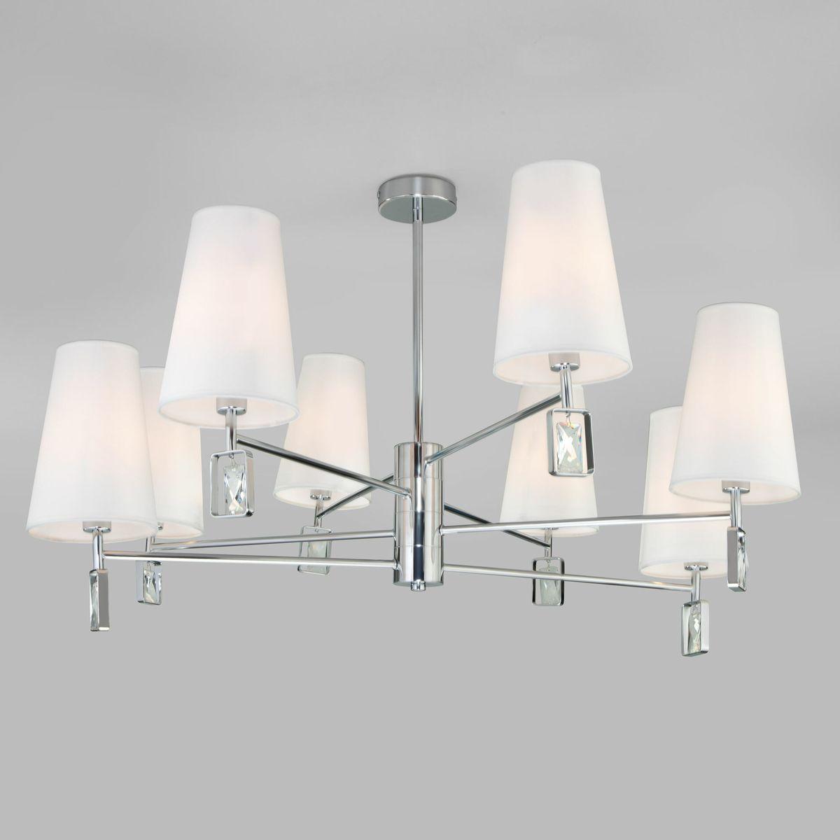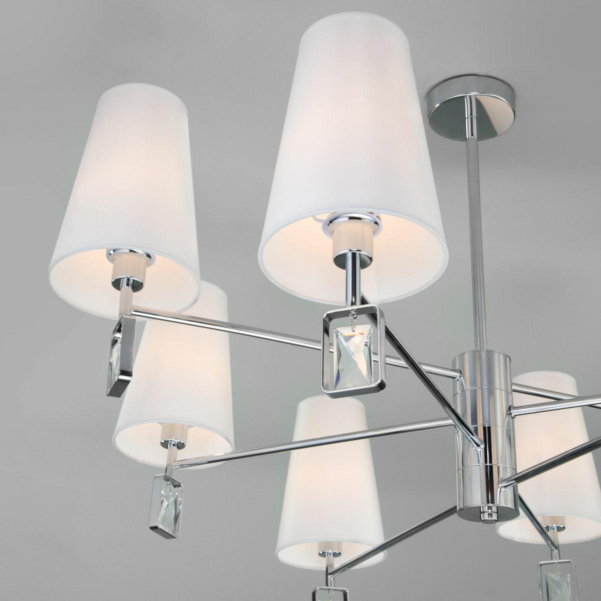 Подвесная люстра Eurosvet Milazzo 60137/8 хром от Китайского бренда из коллекции Milazzo будет удачно смотреться в гостиной в стиле модерн. Светильник выполнен из ткани с плафонами в форме белого цвета.