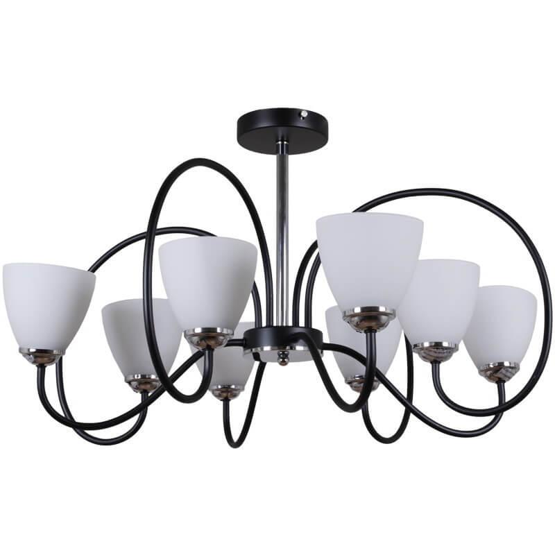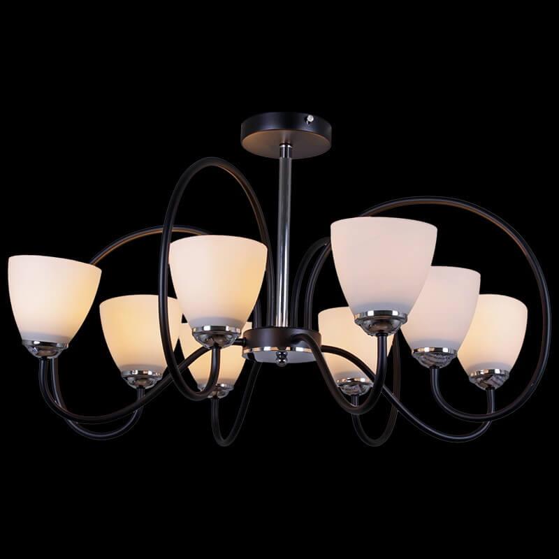 Производитель светильника рекомендует для устройства 8 ламп накаливания с цоколем E27 и мощностью 60 W, что позволит осветить помещение площадью 32 кв.м. Габариты изделия: высота – 400 мм, диаметр – мм.