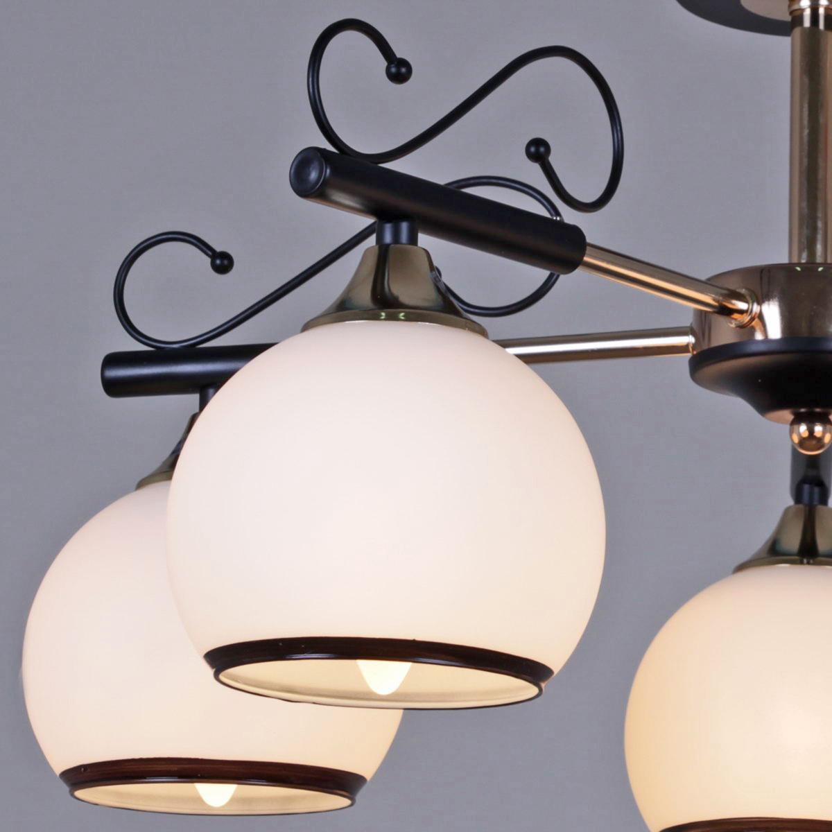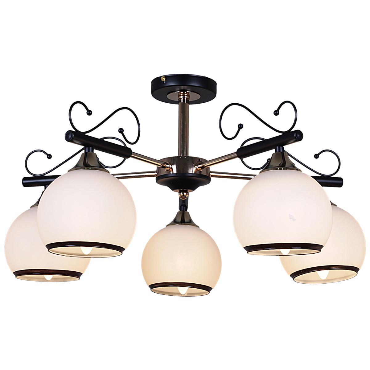 Производитель светильника рекомендует для устройства 5 ламп накаливания с цоколем E27 и мощностью 60 W, что позволит осветить помещение площадью 40 кв.м. Габариты изделия: высота – 280 мм, диаметр – мм.