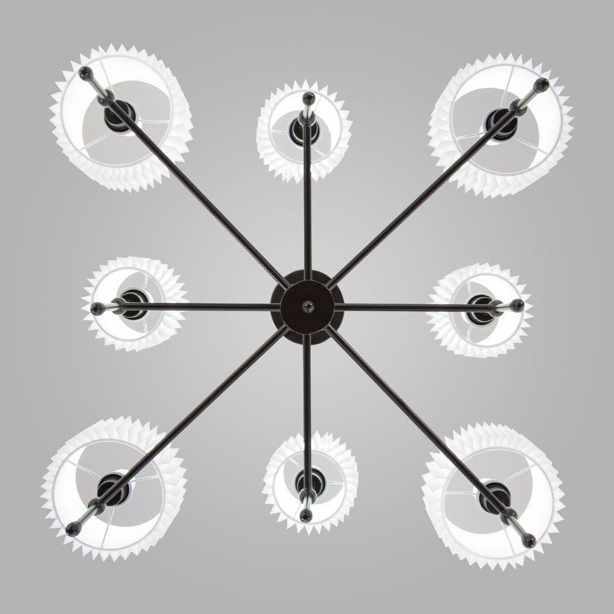 Производитель светильника рекомендует для устройства 8 ламп накаливания с цоколем E14 и мощностью 40 W, что позволит осветить помещение площадью 14 кв.м. Габариты изделия: высота – 640 мм, диаметр – 840 мм.