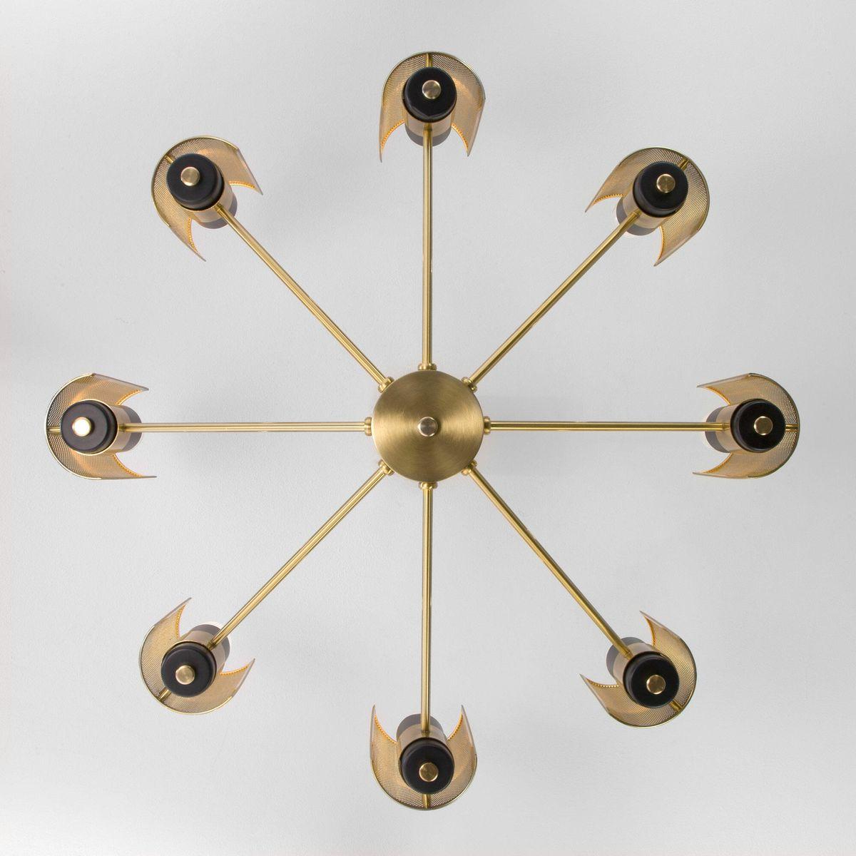 Производитель светильника рекомендует для устройства 8 ламп накаливания с цоколем E14 и мощностью 60 W, что позволит осветить помещение площадью 14 кв.м. Габариты изделия: высота – 450 мм, диаметр – 850 мм.
