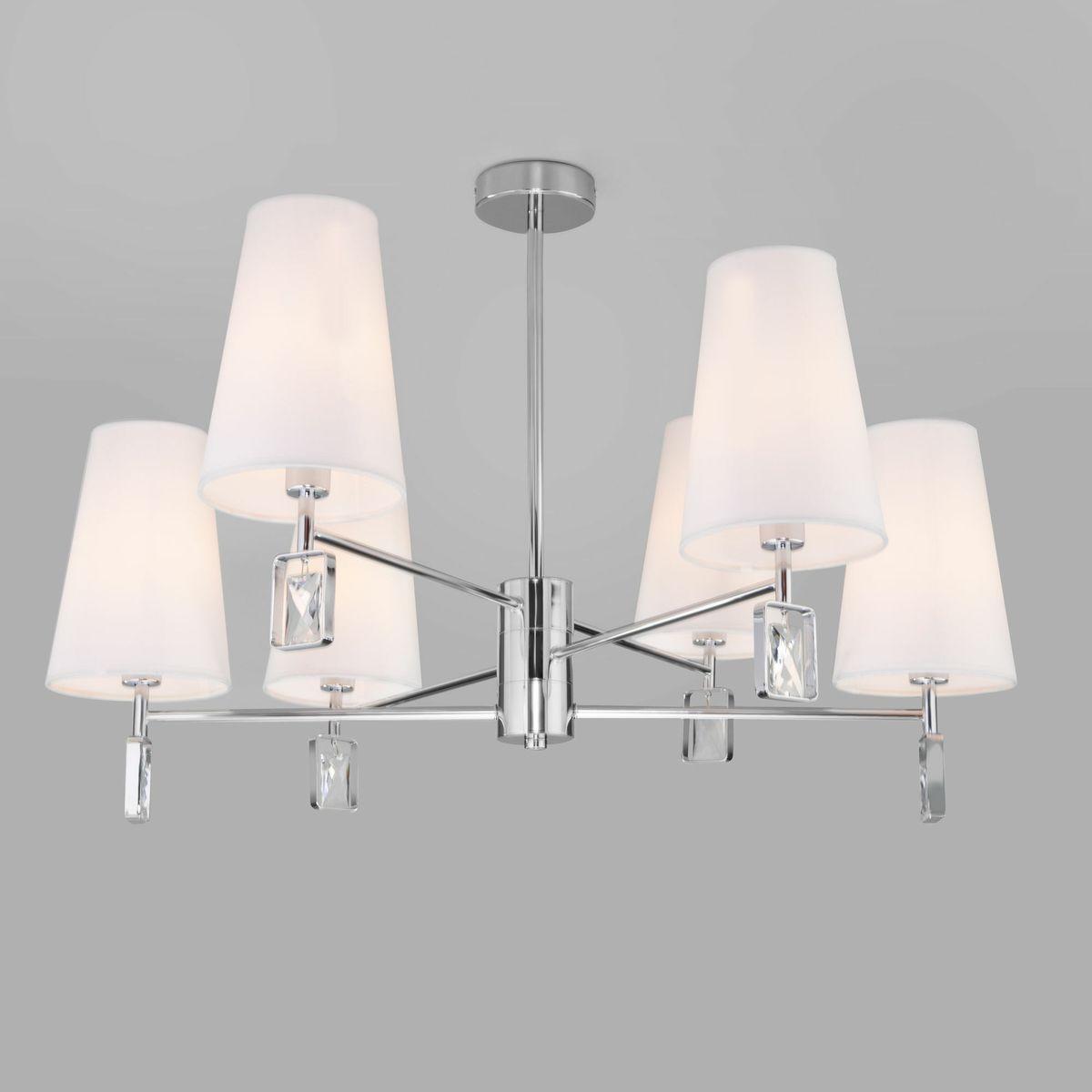 Потолочная люстра Eurosvet Milazzo 60137/6 хром от Китайского бренда из коллекции Milazzo будет удачно смотреться в спальни в стиле модерн. Светильник выполнен из ткани с плафонами в форме белого цвета.