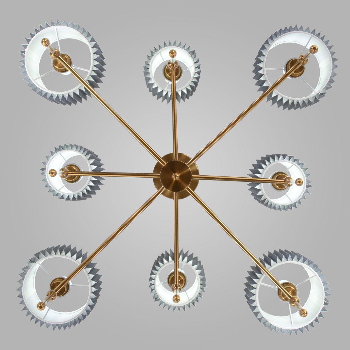 Производитель светильника рекомендует для устройства 8 ламп накаливания с цоколем E14 и мощностью 40 W, что позволит осветить помещение площадью 14 кв.м. Габариты изделия: высота – 640 мм, диаметр – 840 мм.