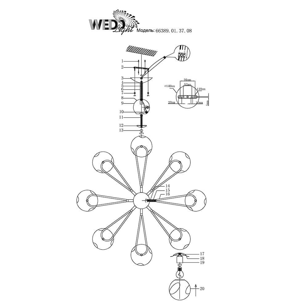 Производитель светильника рекомендует для устройства 8 ламп накаливания с цоколем E27 и мощностью 60 W, что позволит осветить помещение площадью 24 кв.м. Габариты изделия: высота – 320 мм, диаметр – 790 мм.