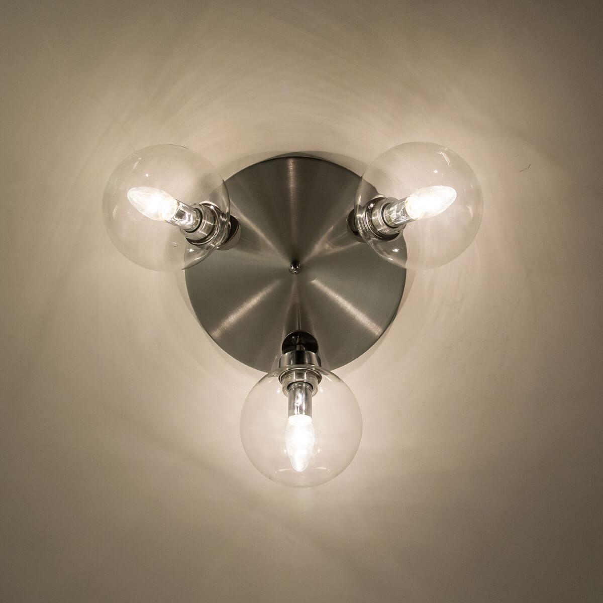 Производитель светильника рекомендует для устройства 3 лампы накаливания с цоколем E14 и мощностью 40 W, что позволит осветить помещение площадью 6,7 кв.м. Габариты изделия: высота – 160 мм, диаметр – 550 мм.