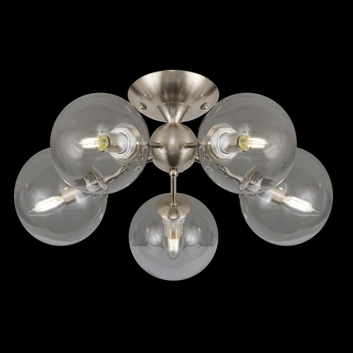 Производитель светильника рекомендует для устройства 5 ламп накаливания с цоколем E14 и мощностью 40 W, что позволит осветить помещение площадью 11,1 кв.м. Габариты изделия: высота – 245 мм, диаметр – 520 мм.