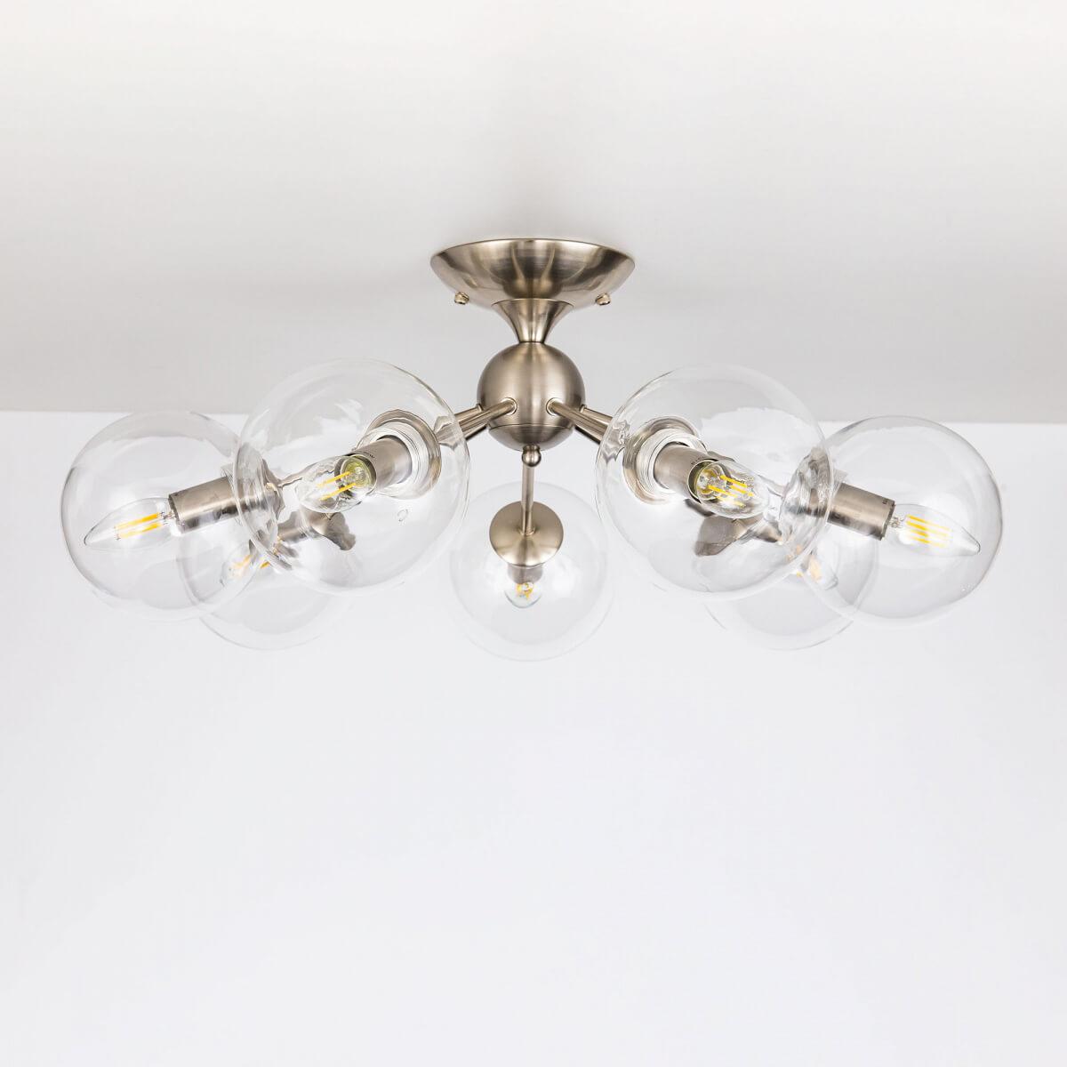 Производитель светильника рекомендует для устройства 7 ламп накаливания с цоколем E14 и мощностью 40 W, что позволит осветить помещение площадью 15,6 кв.м. Габариты изделия: высота – 260 мм, диаметр – 665 мм.