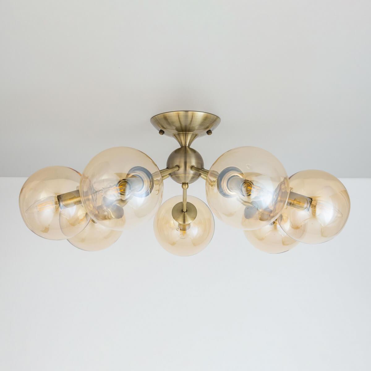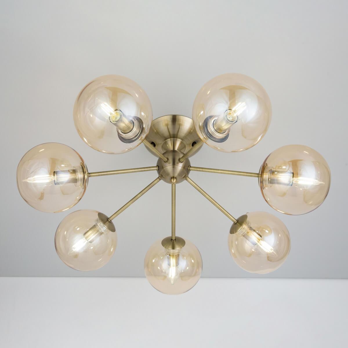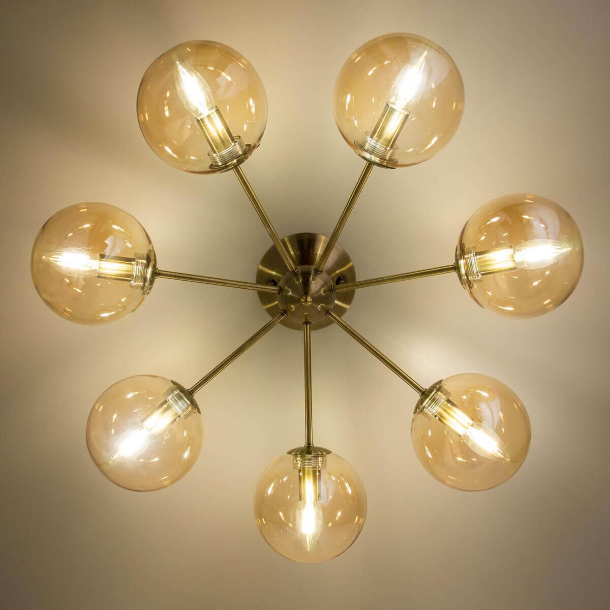 Производитель светильника рекомендует для устройства 7 ламп накаливания с цоколем E14 и мощностью 40 W, что позволит осветить помещение площадью 15,6 кв.м. Габариты изделия: высота – 260 мм, диаметр – 665 мм.