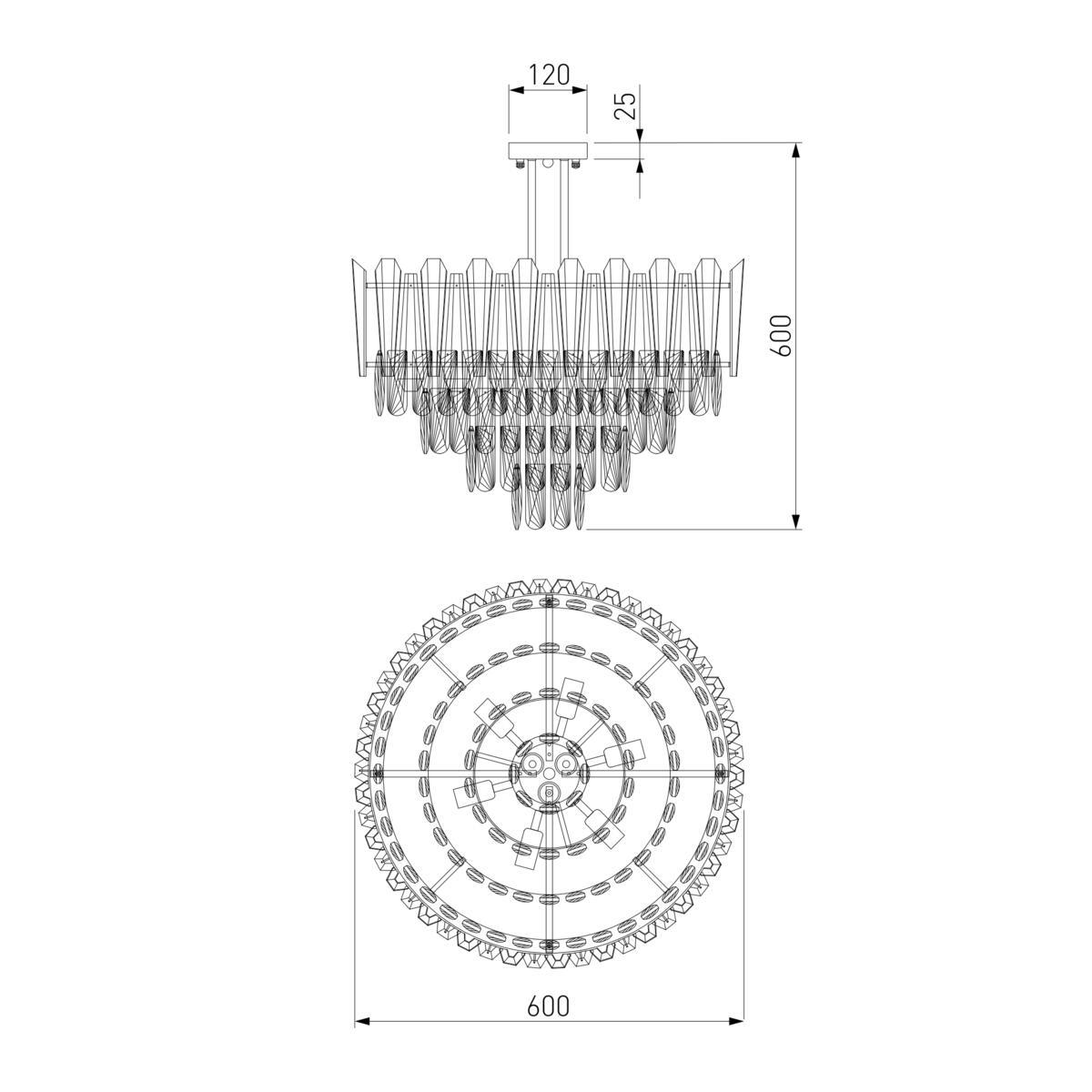 Производитель светильника рекомендует для устройства 9 ламп накаливания с цоколем E14 и мощностью 60 W, что позволит осветить помещение площадью 30 кв.м. Габариты изделия: высота – 600 мм, диаметр – 600 мм.