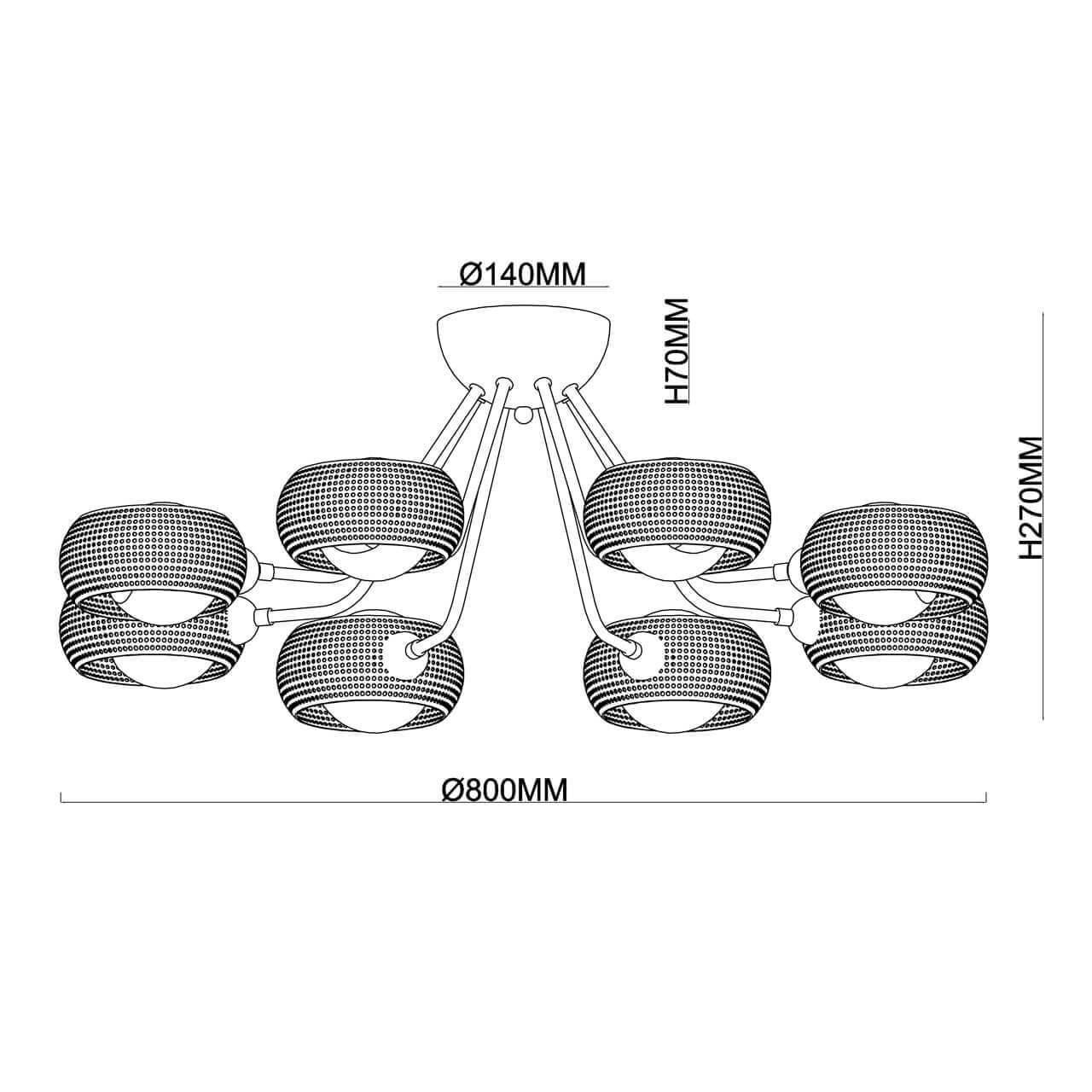 Производитель светильника рекомендует для устройства 8 светодиодных ламп с цоколем E14 и мощностью 40 W, что позволит осветить помещение площадью 22 кв.м. Габариты изделия: высота – 270 мм, диаметр – 800 мм.