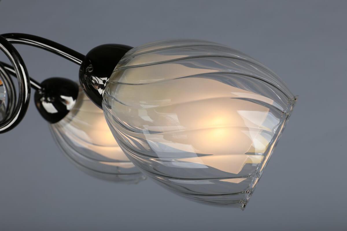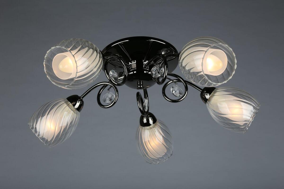Производитель светильника рекомендует для устройства 5 ламп накаливания с цоколем E14 и мощностью 60 W, что позволит осветить помещение площадью 16,7 кв.м. Габариты изделия: высота – 200 мм, диаметр – 550 мм.