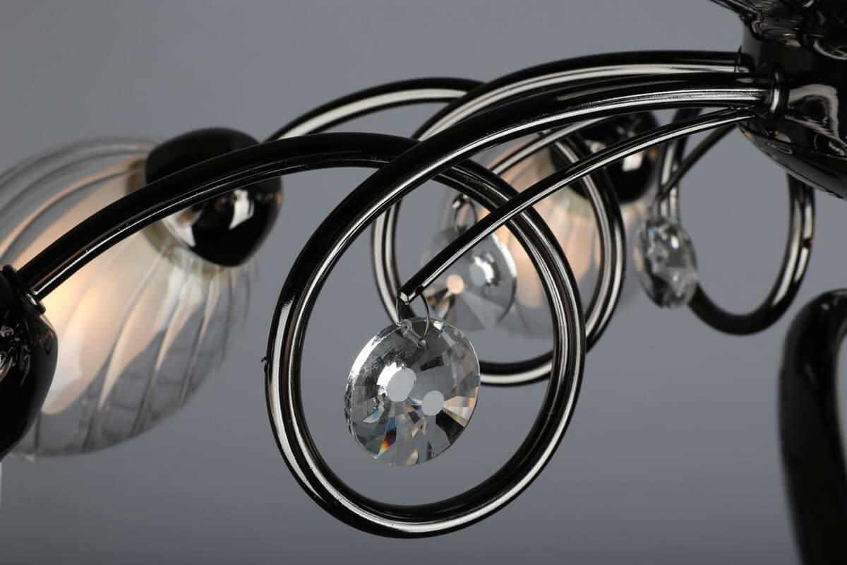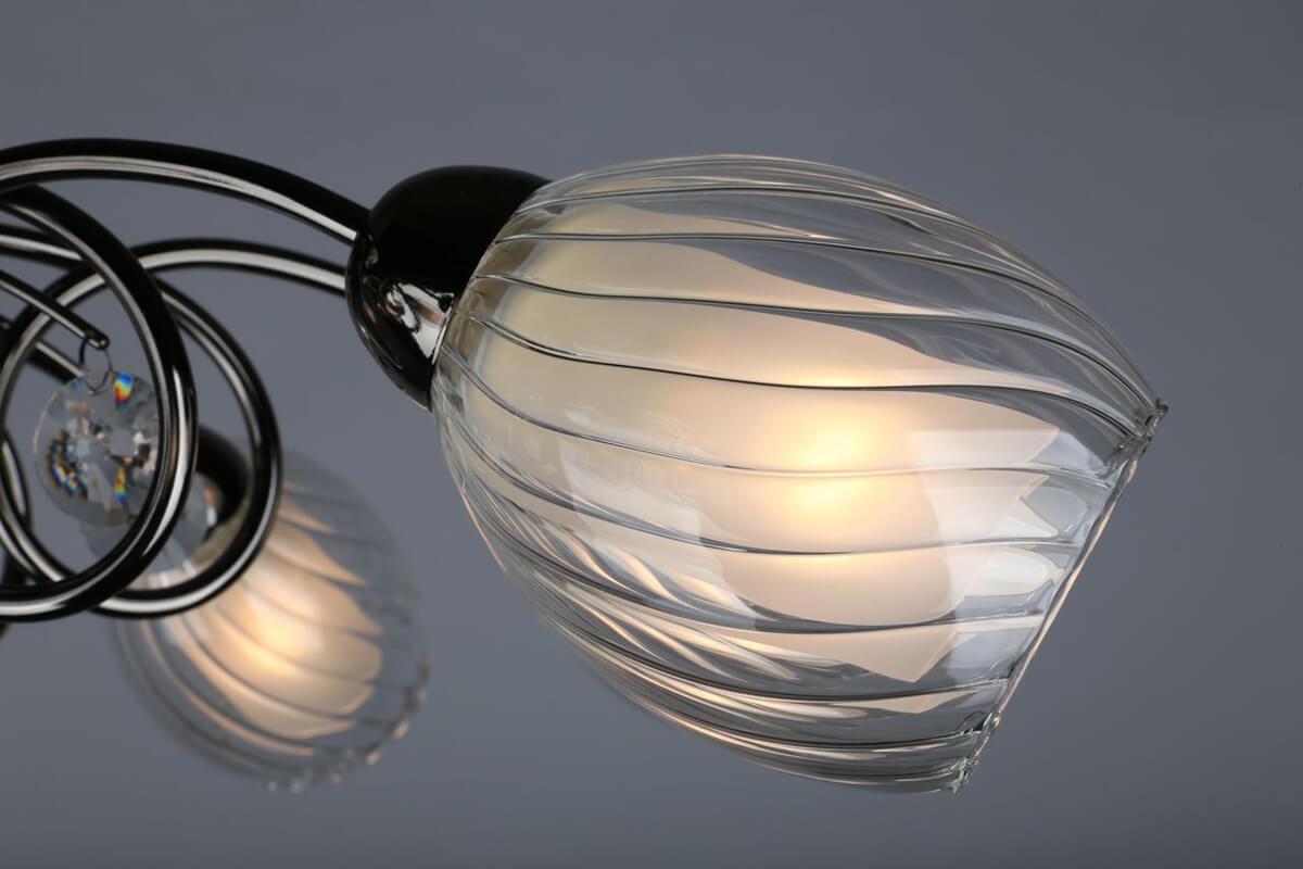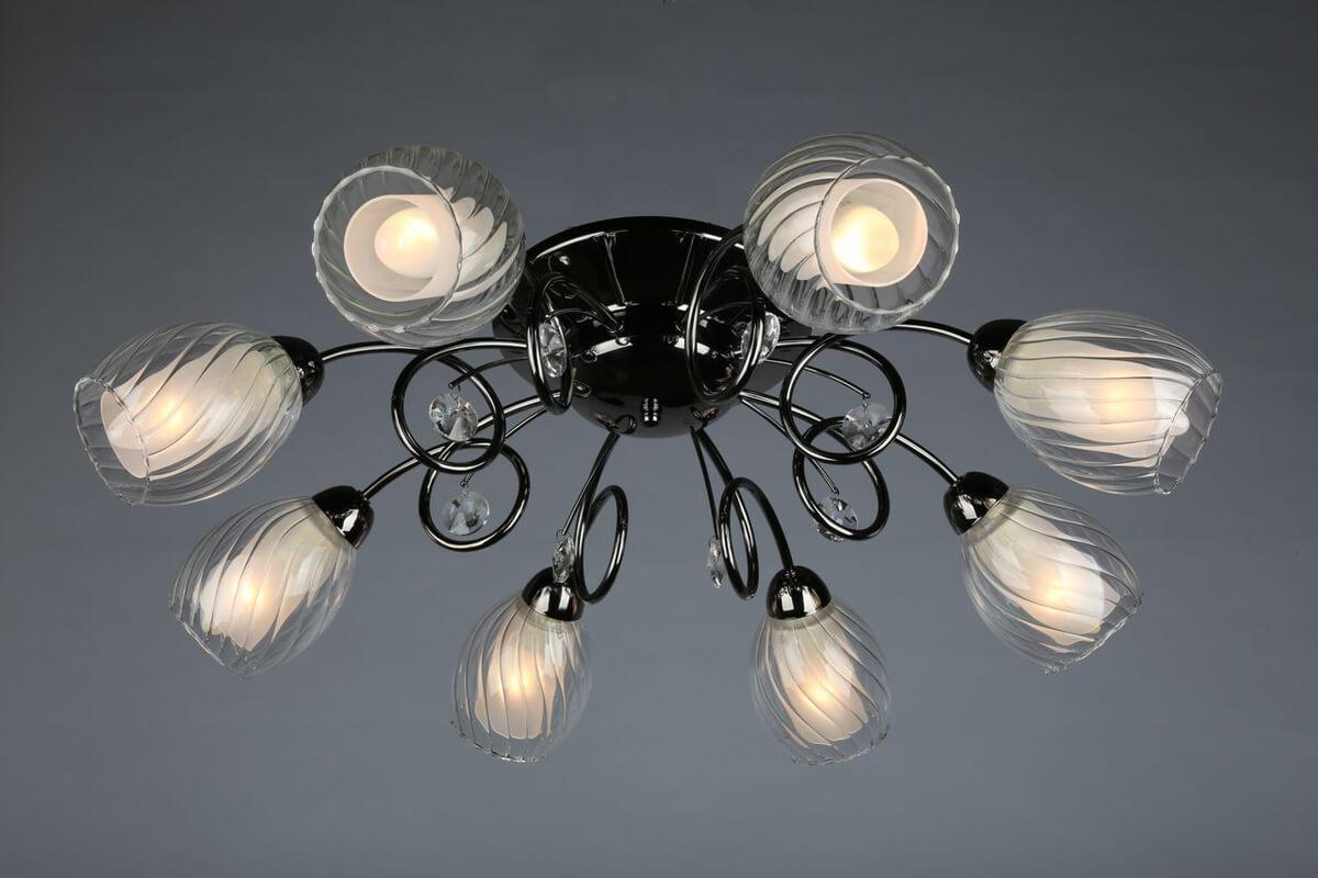 Производитель светильника рекомендует для устройства 8 ламп накаливания с цоколем E14 и мощностью 60 W, что позволит осветить помещение площадью 26,7 кв.м. Габариты изделия: высота – 200 мм, диаметр – 700 мм.