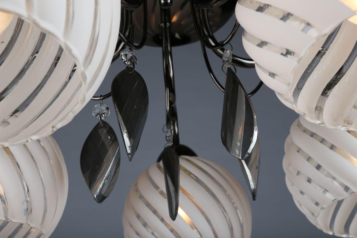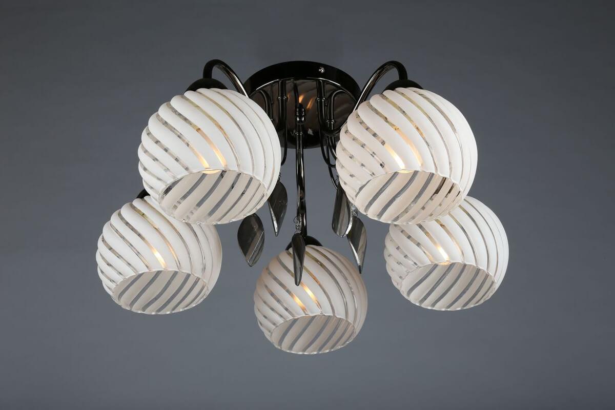 Производитель светильника рекомендует для устройства 5 ламп накаливания с цоколем E27 и мощностью 60 W, что позволит осветить помещение площадью 16,7 кв.м. Габариты изделия: высота – 250 мм, диаметр – 500 мм.