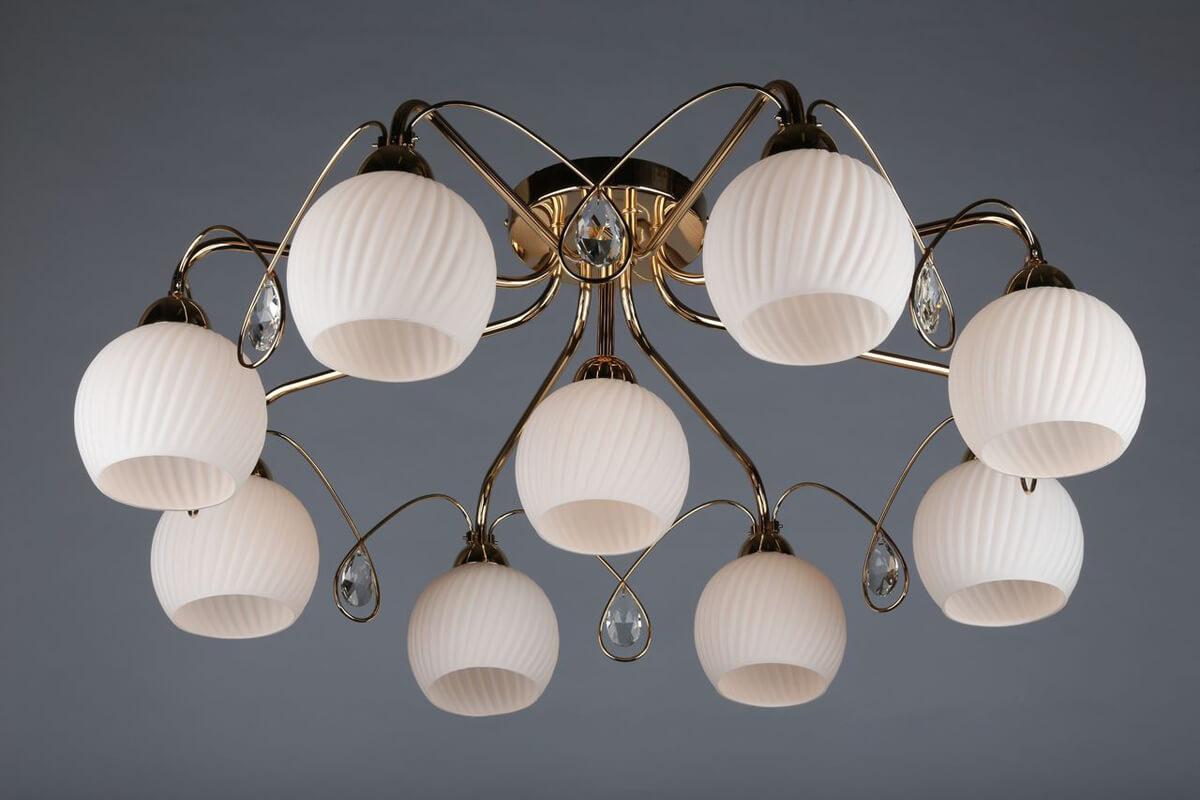 Производитель светильника рекомендует для устройства 9 ламп накаливания с цоколем E14 и мощностью 60 W, что позволит осветить помещение площадью 30,0 кв.м. Габариты изделия: высота – 300 мм, диаметр – 750 мм.