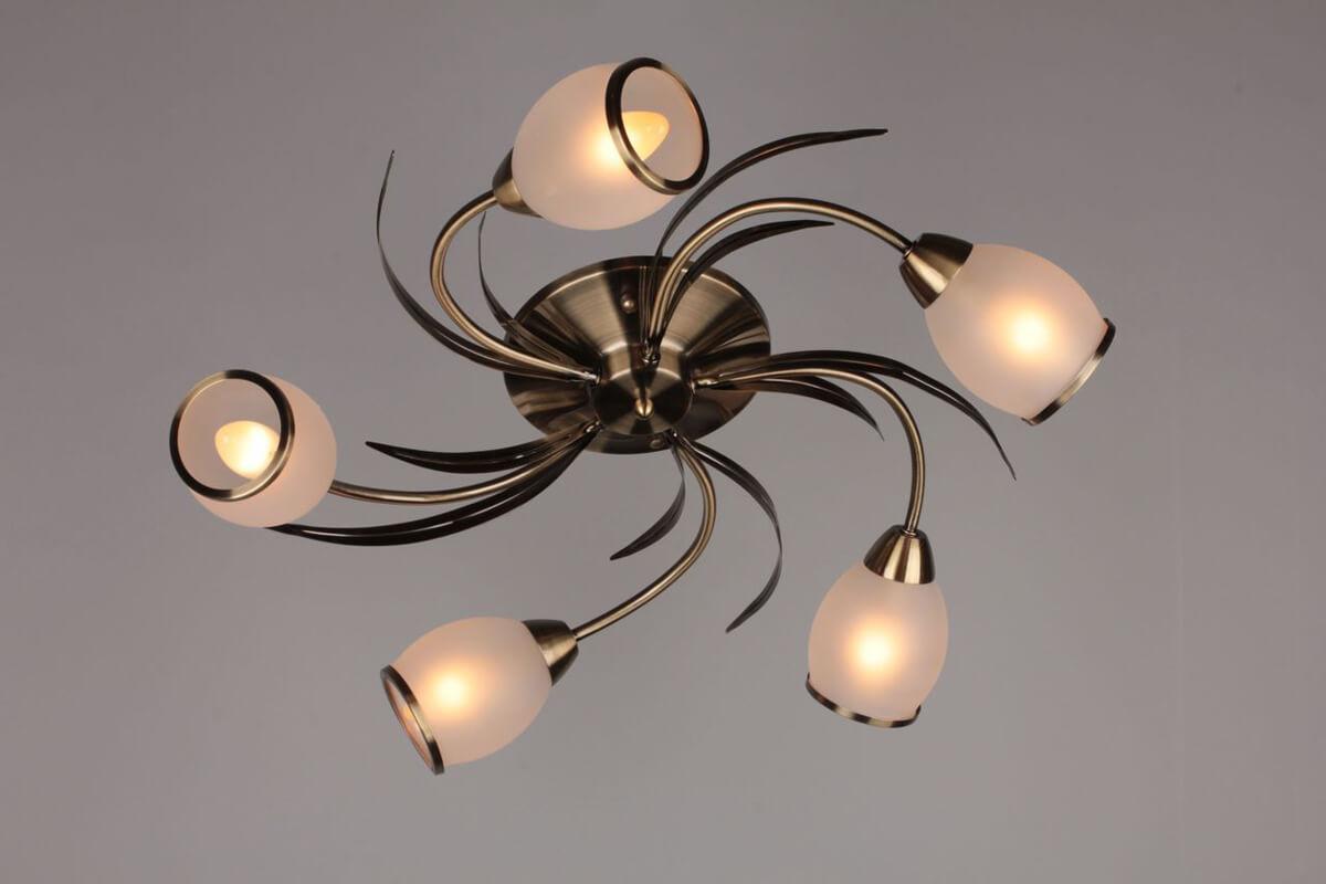 Производитель светильника рекомендует для устройства 5 ламп накаливания с цоколем E14 и мощностью 60 W, что позволит осветить помещение площадью 16,7 кв.м. Габариты изделия: высота – 160 мм, диаметр – 600 мм.