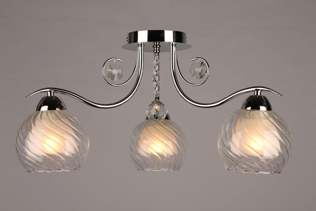 Производитель светильника рекомендует для устройства 3 лампы накаливания с цоколем E14 и мощностью 60 W, что позволит осветить помещение площадью 10 кв.м. Габариты изделия: высота – 270 мм, диаметр – 560 мм.
