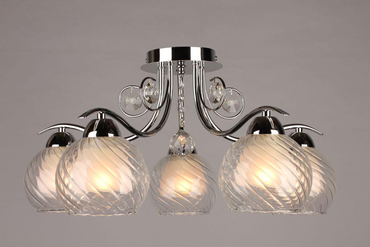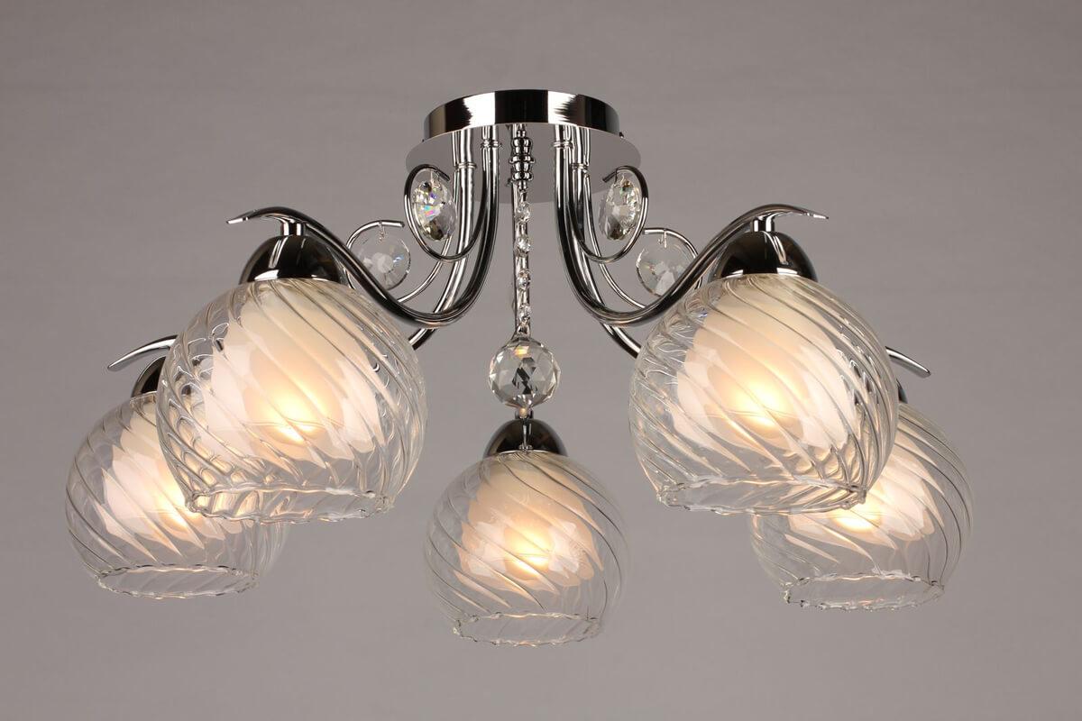 Производитель светильника рекомендует для устройства 5 ламп накаливания с цоколем E14 и мощностью 60 W, что позволит осветить помещение площадью 16,7 кв.м. Габариты изделия: высота – 270 мм, диаметр – 560 мм.