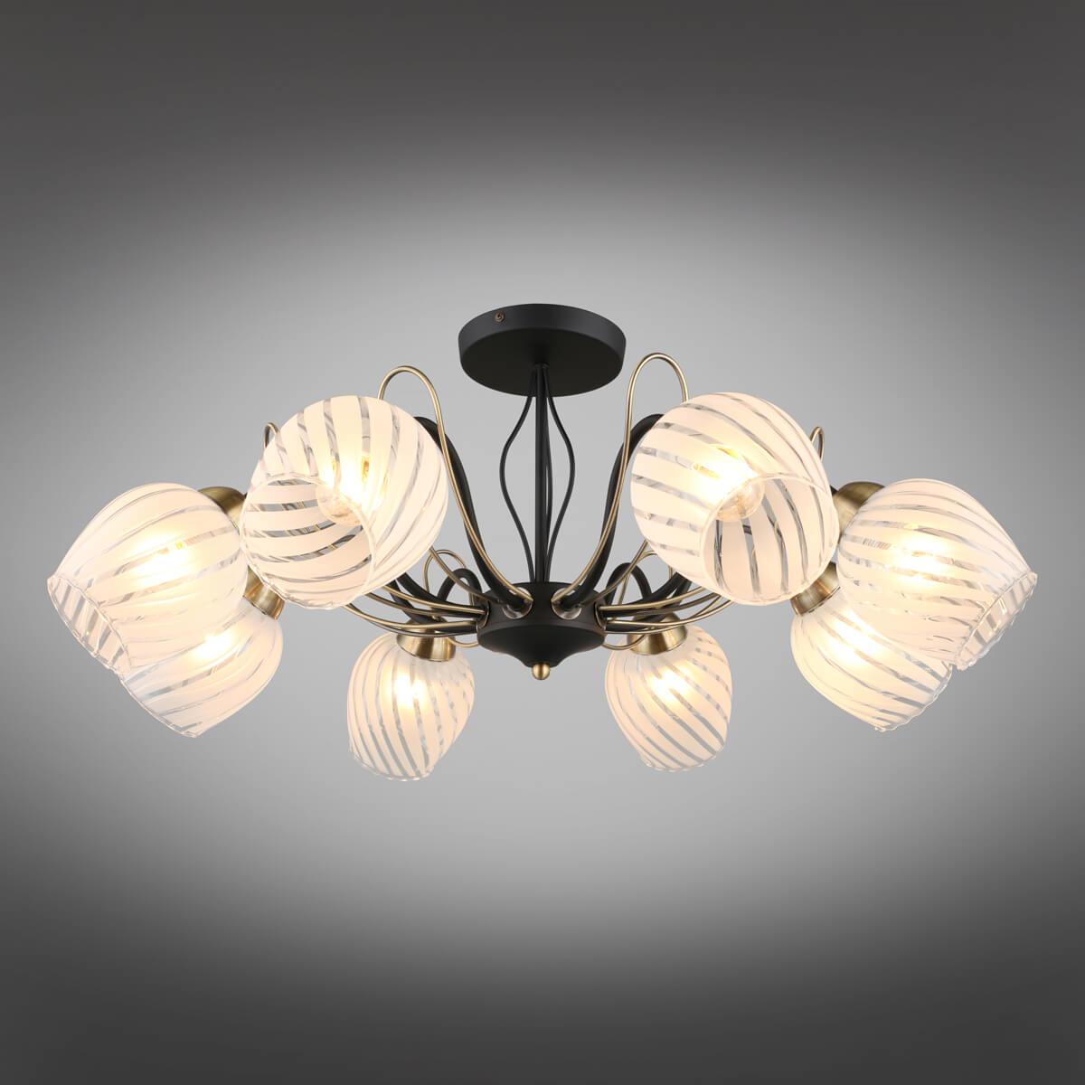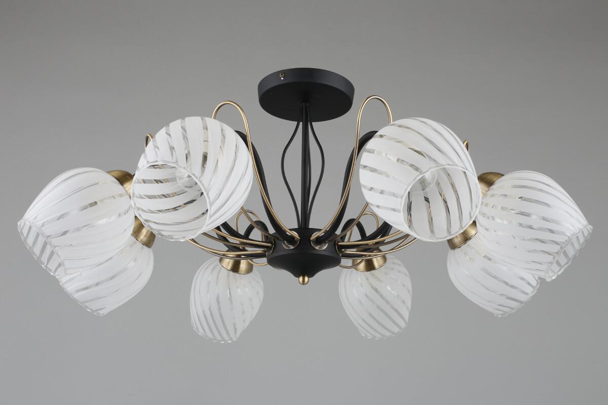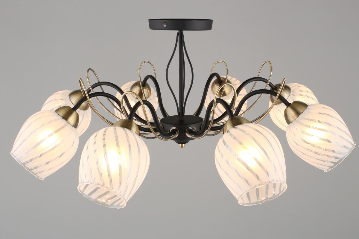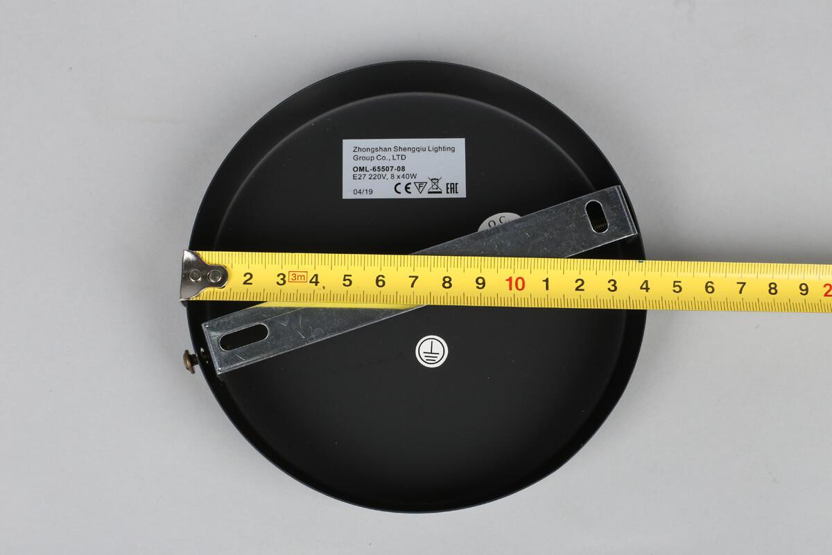 Производитель светильника рекомендует для устройства 8 ламп накаливания с цоколем E27 и мощностью 40 W, что позволит осветить помещение площадью 16 кв.м. Габариты изделия: высота – 330 мм, диаметр – 770 мм.