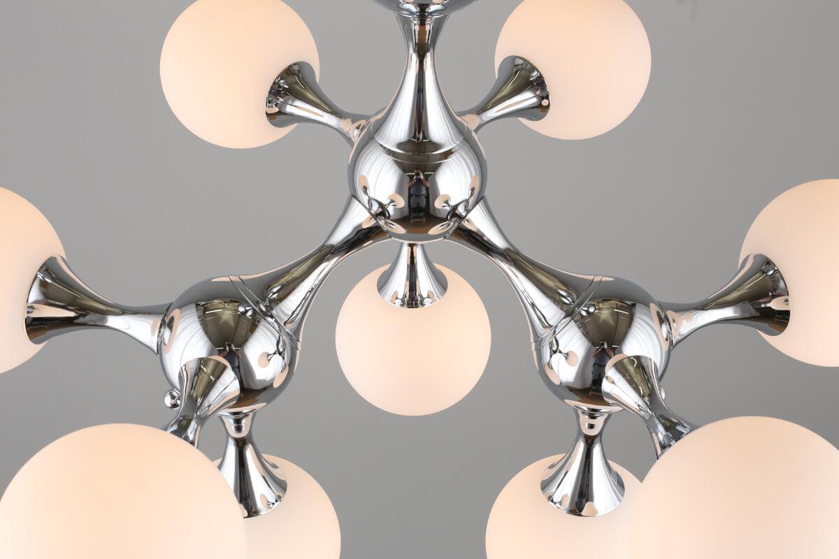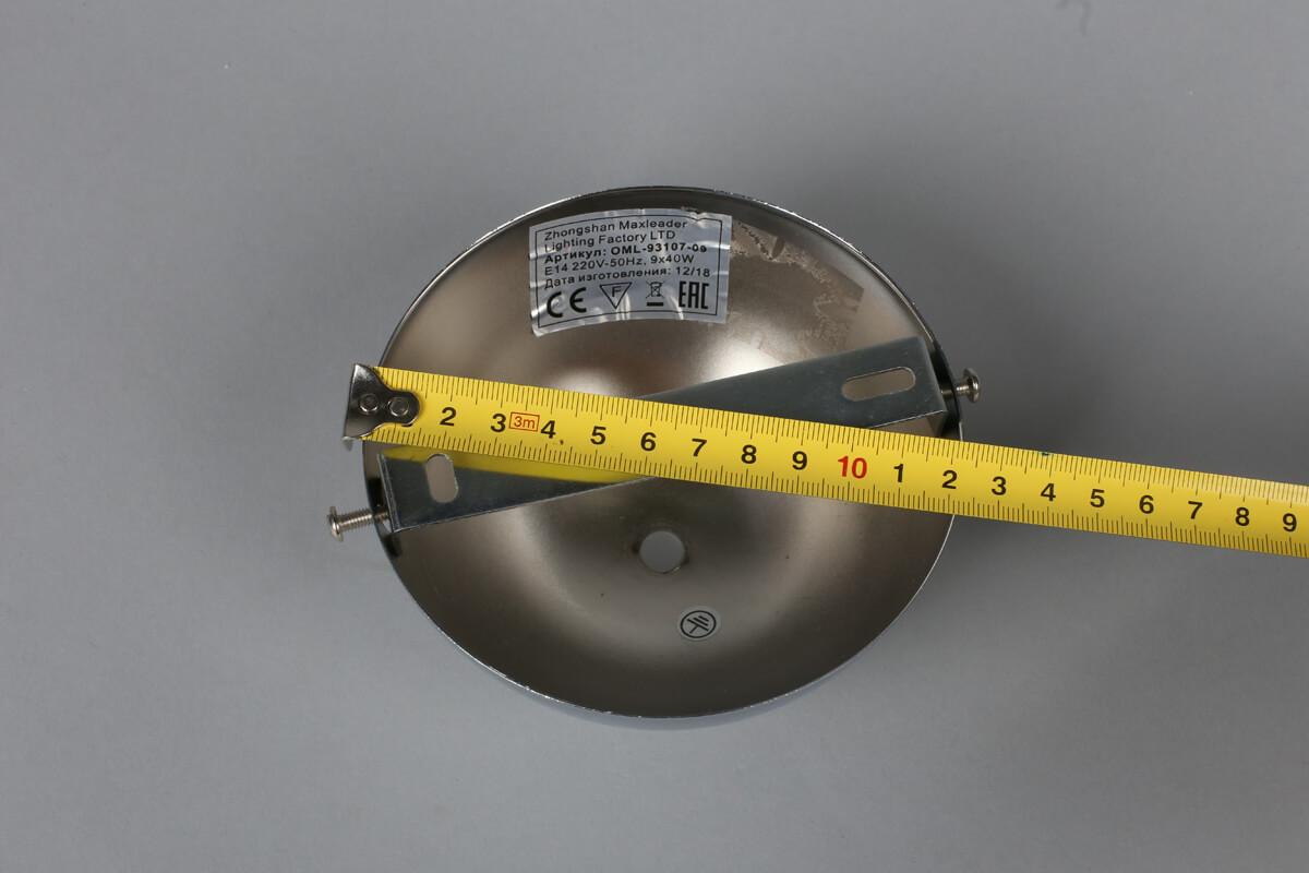 Производитель светильника рекомендует для устройства 9 ламп накаливания с цоколем E14 и мощностью 40 W, что позволит осветить помещение площадью 18 кв.м. Габариты изделия: высота – 600 мм, диаметр – 700 мм.