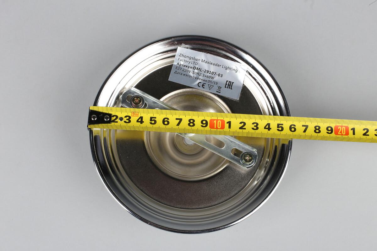 Производитель светильника рекомендует для устройства 3 лампы накаливания с цоколем E27 и мощностью 60 W, что позволит осветить помещение площадью 9 кв.м. Габариты изделия: высота – 300 мм, диаметр – 700 мм.