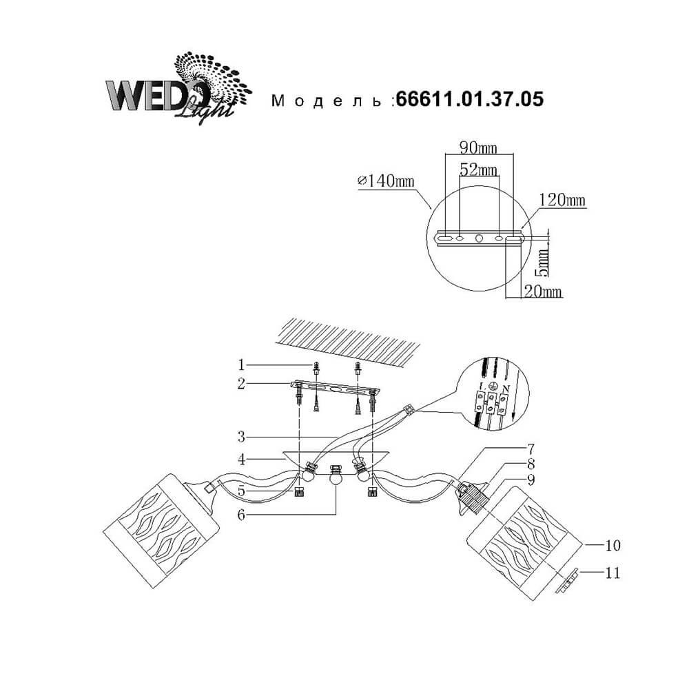 Производитель светильника рекомендует для устройства 5 ламп накаливания с цоколем E27 и мощностью 60 W, что позволит осветить помещение площадью 15 кв.м. Габариты изделия: высота – 180 мм, диаметр – 620 мм.