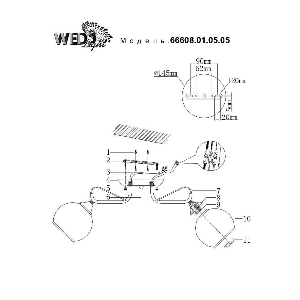 Производитель светильника рекомендует для устройства 5 ламп накаливания с цоколем E27 и мощностью 60 W, что позволит осветить помещение площадью 15 кв.м. Габариты изделия: высота – 210 мм, диаметр – 580 мм.