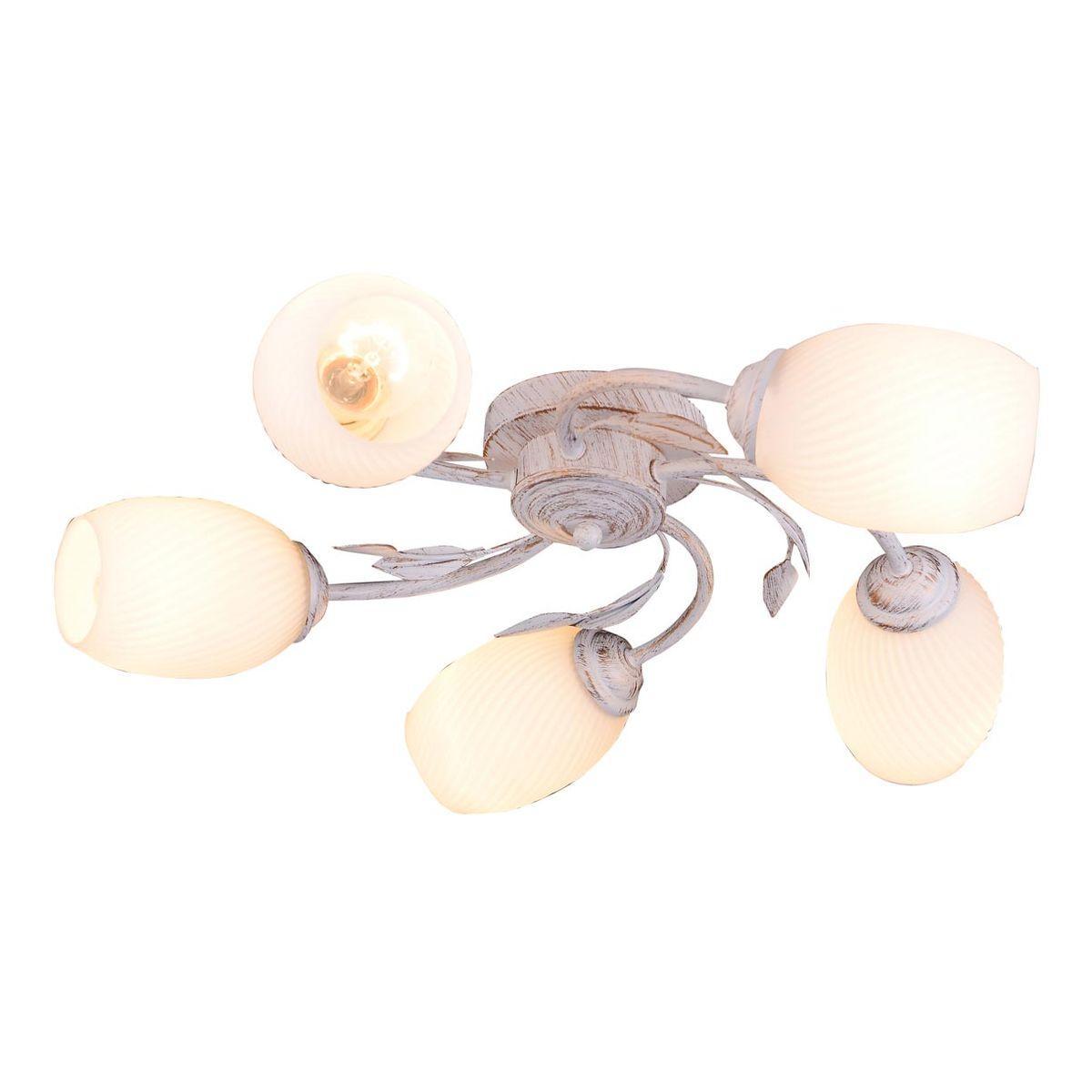 Производитель светильника рекомендует для устройства 5 ламп накаливания с цоколем E27 и мощностью 60 W, что позволит осветить помещение площадью 16,7 кв.м. Габариты изделия: высота – 120 мм, диаметр – 560 мм.