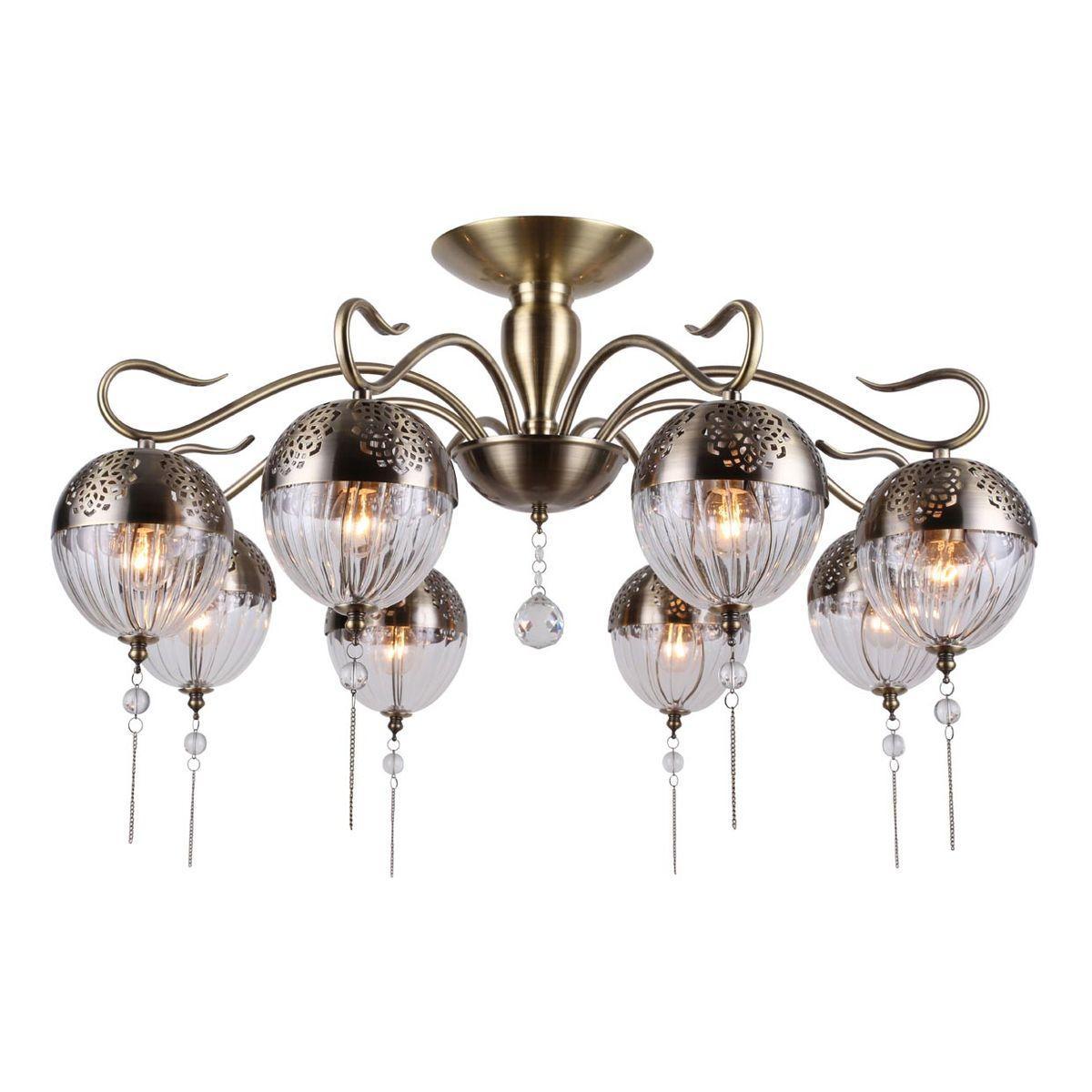 Производитель светильника рекомендует для устройства 8 ламп накаливания с цоколем E14 и мощностью 40 W, что позволит осветить помещение площадью 17,8 кв.м. Габариты изделия: высота – 460 мм, диаметр – 750 мм.