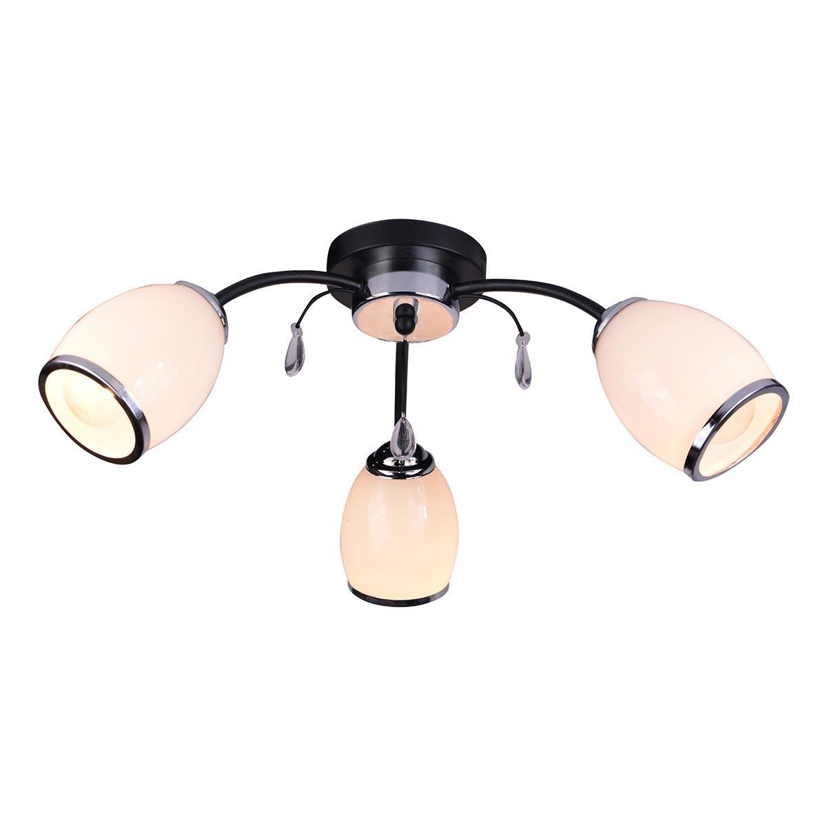Производитель светильника рекомендует для устройства 3 лампы накаливания с цоколем E27 и мощностью 60 W, что позволит осветить помещение площадью 10 кв.м. Габариты изделия: высота – 190 мм, диаметр – 550 мм.