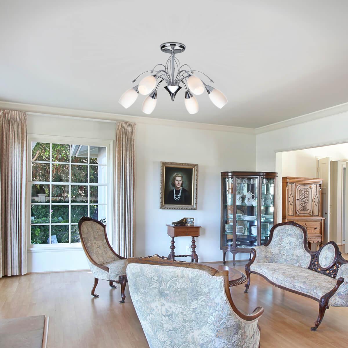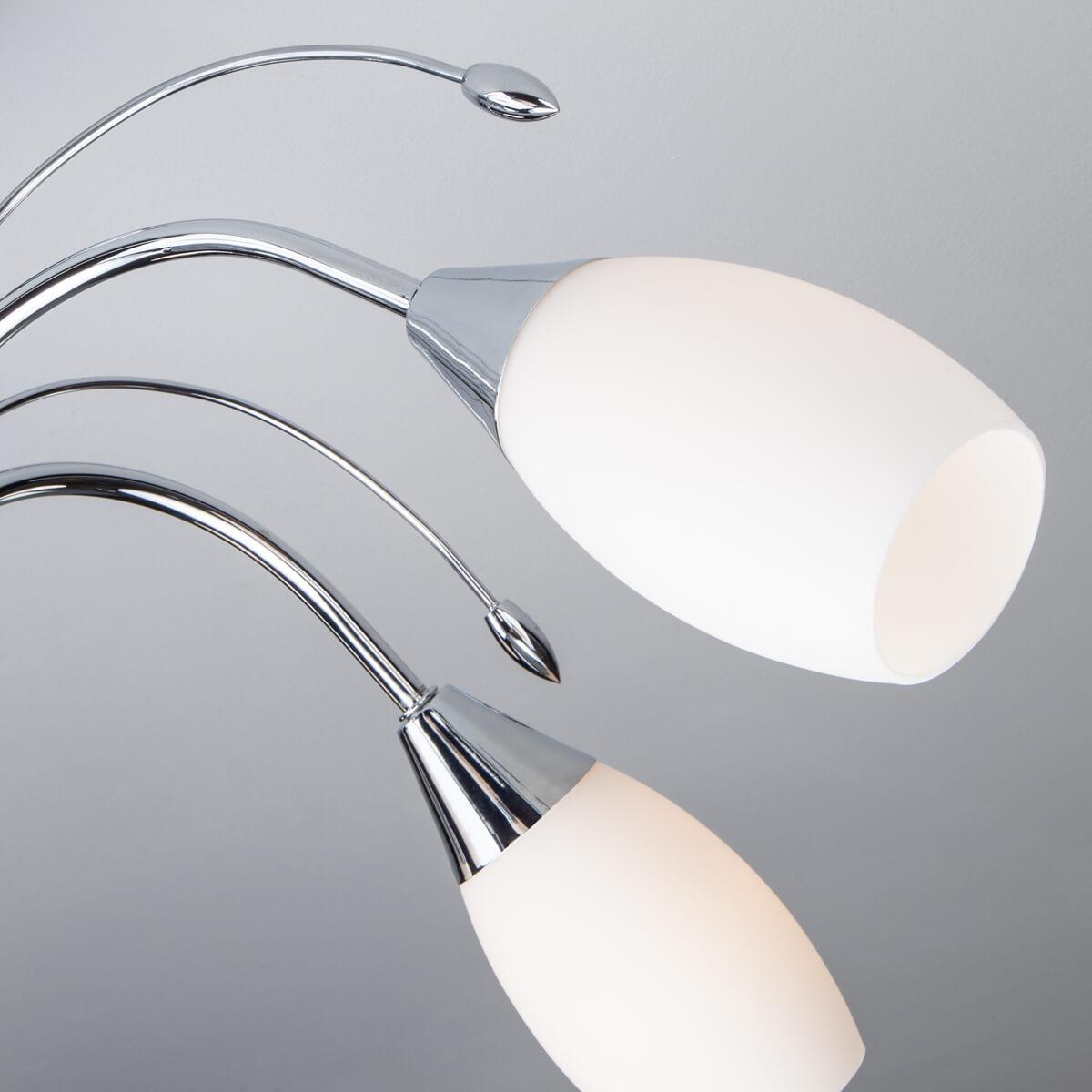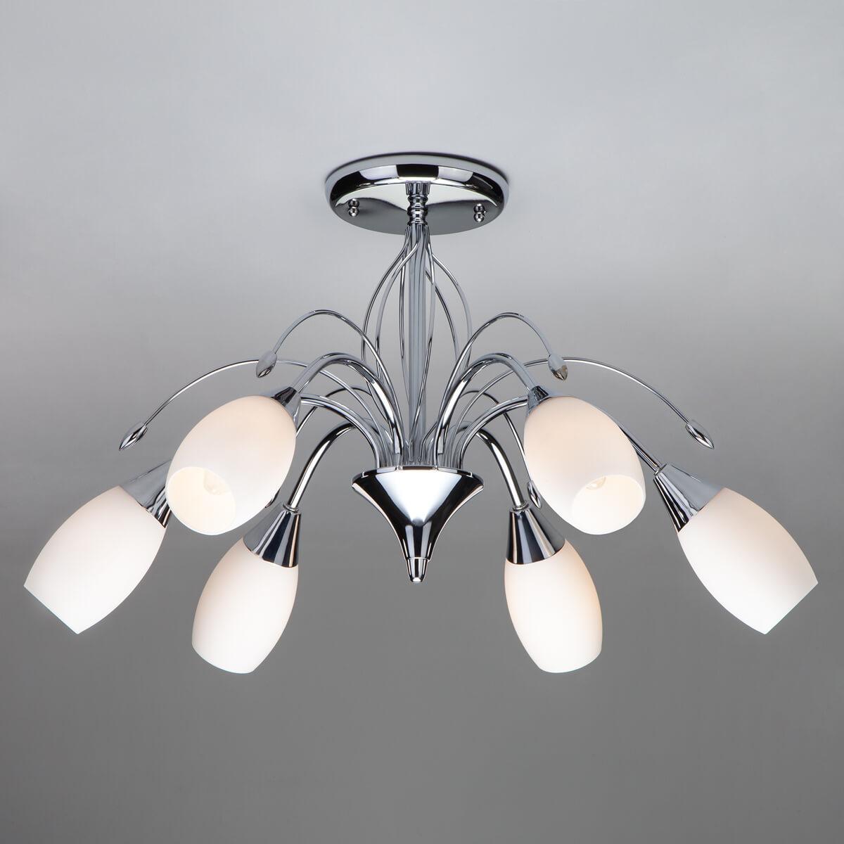 Потолочная люстра Eurosvet 22080/6 хром от Китайского бренда Eurosvet из коллекции 22080 Хром будет удачно смотреться в гостиной в стиле флористика. Светильник выполнен из стекла с плафонами в форме овала белого цвета.