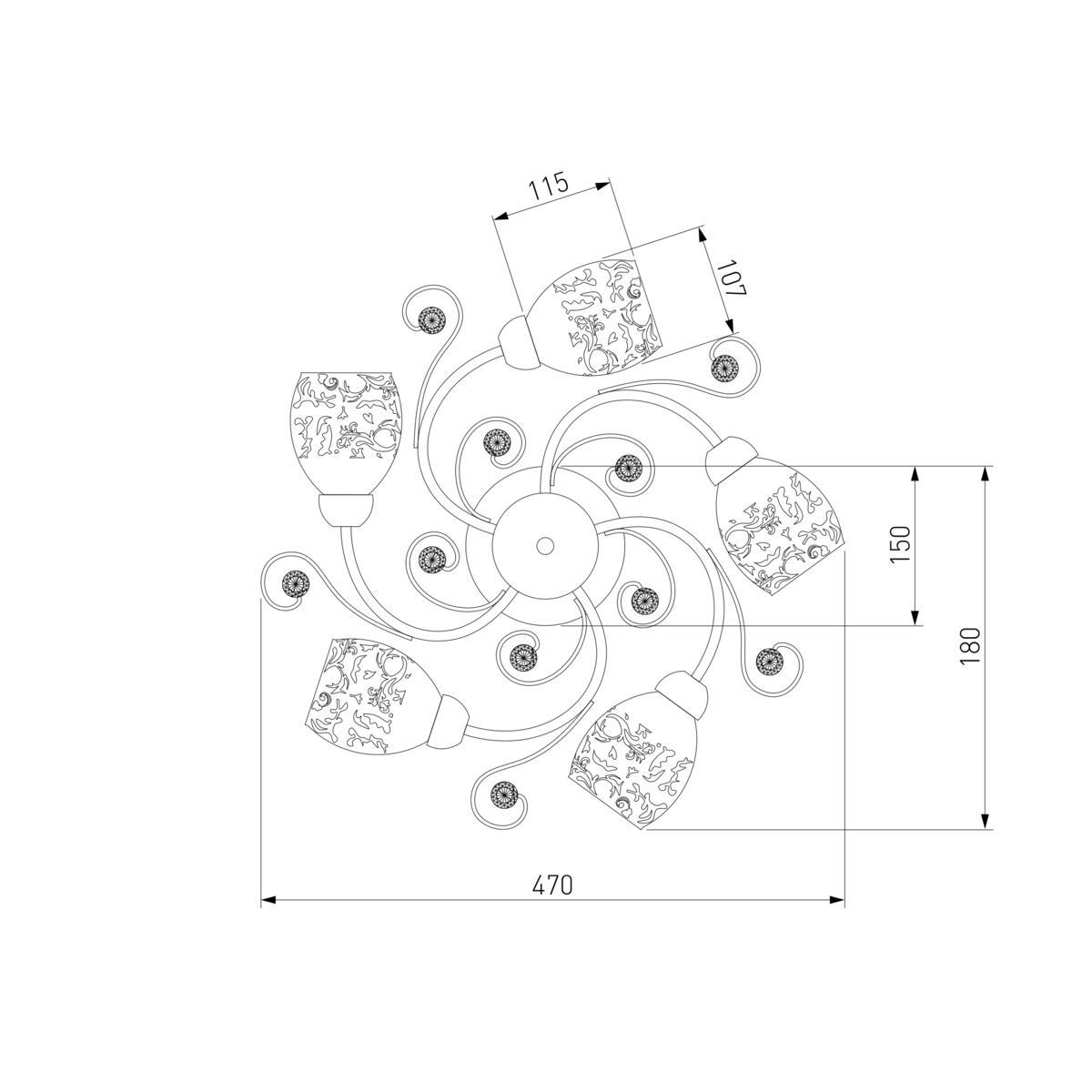 Производитель светильника рекомендует для устройства 5 ламп накаливания с цоколем E27 и мощностью 60 W, что позволит осветить помещение площадью кв.м. Габариты изделия: высота – 220 мм, диаметр – 550 мм.