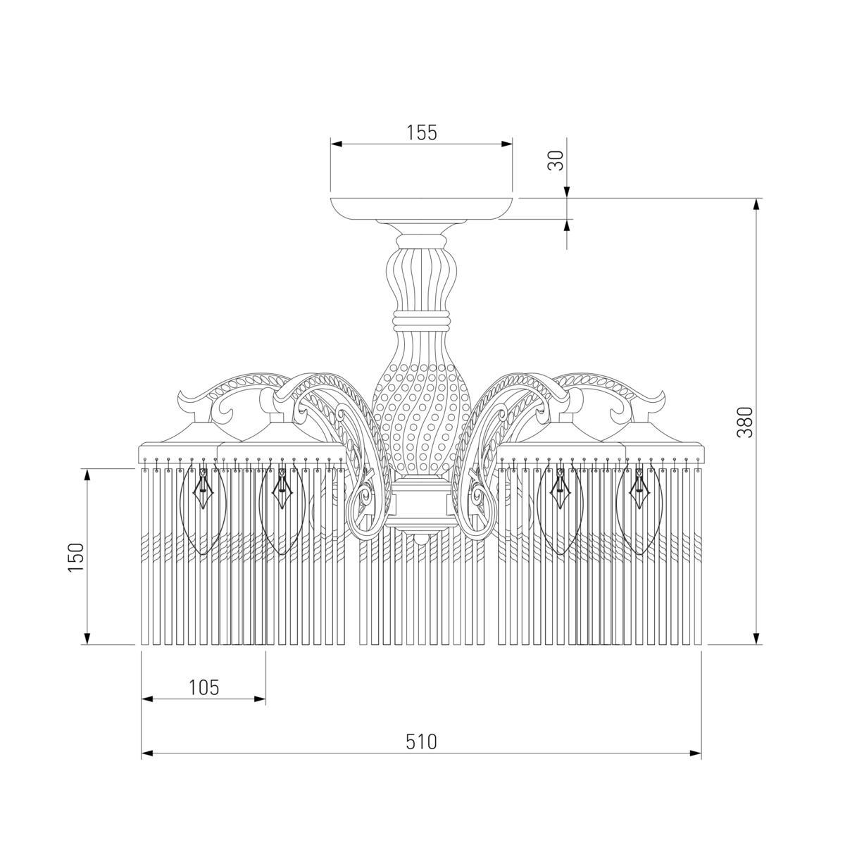 Производитель светильника рекомендует для устройства 5 ламп накаливания с цоколем E14 и мощностью 60 W, что позволит осветить помещение площадью кв.м. Габариты изделия: высота – 300 мм, диаметр – 520 мм.