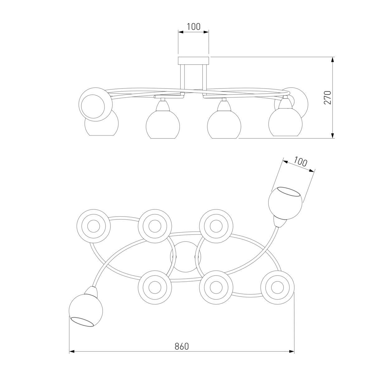Производитель светильника рекомендует для устройства 8 ламп накаливания с цоколем E14 и мощностью 40 W, что позволит осветить помещение площадью кв.м. Габариты изделия: высота – 240 мм, диаметр – мм.