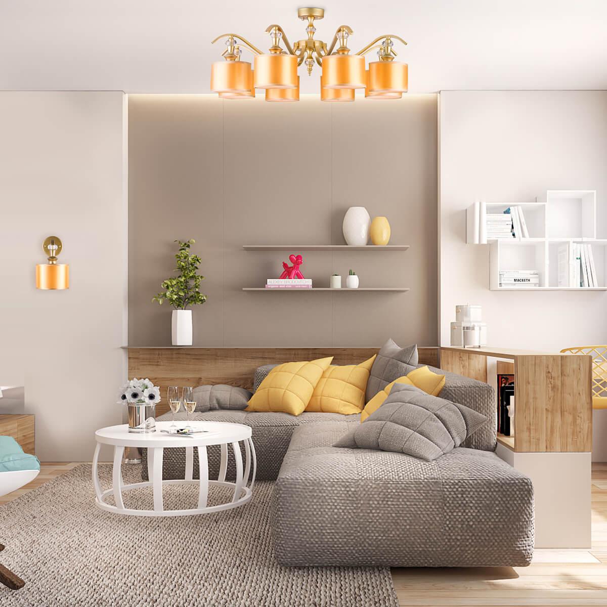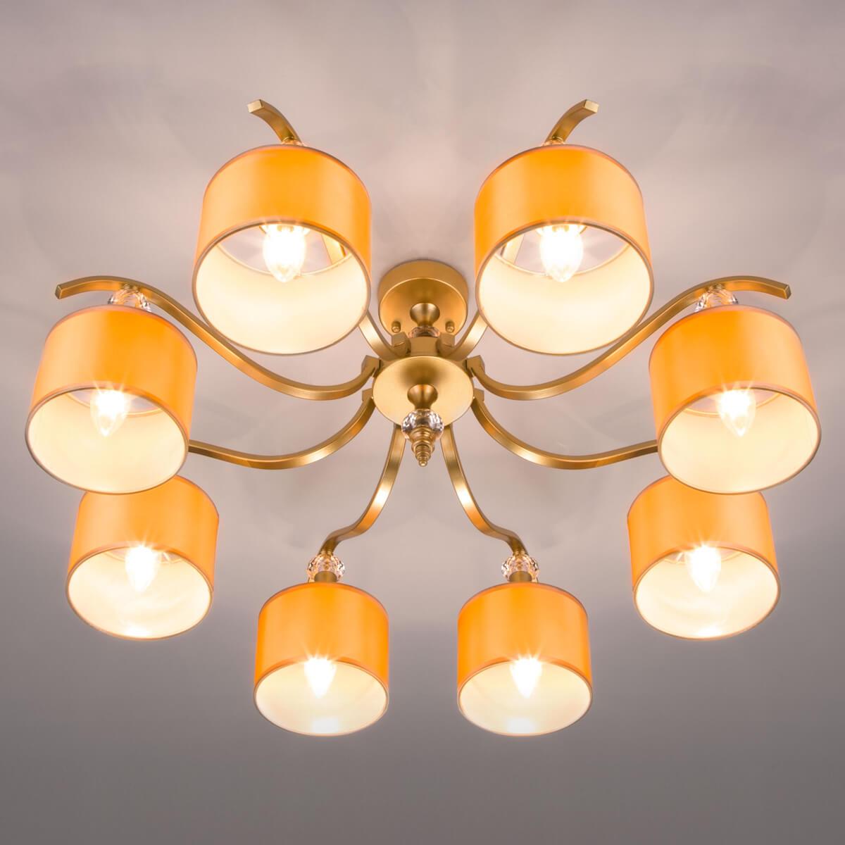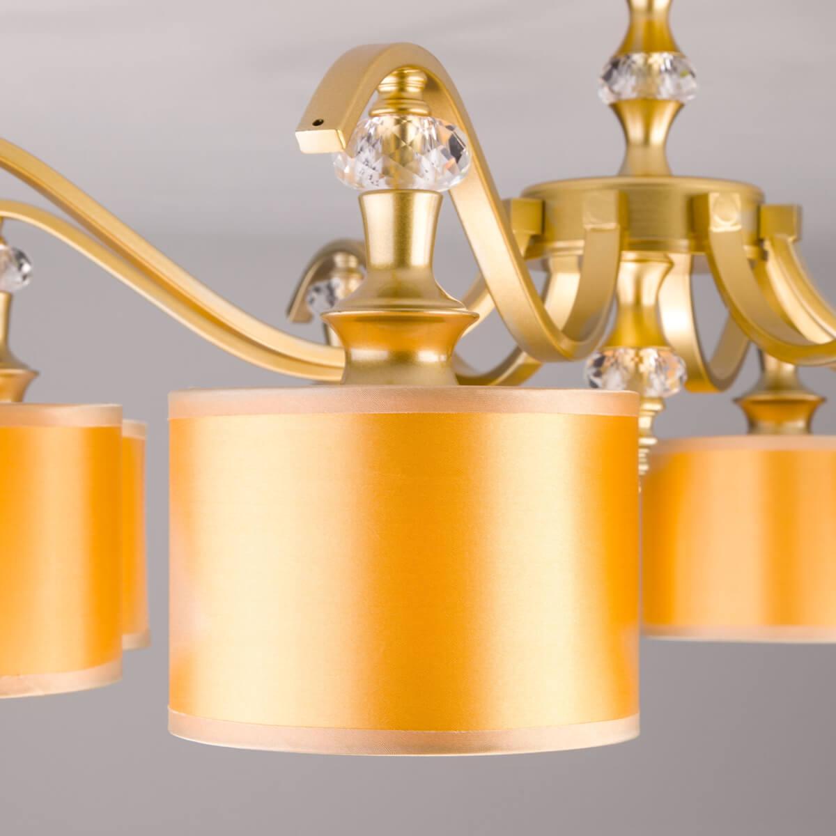 Потолочная люстра Eurosvet 60070/8 перламутровое золото от Российского бренда Eurosvet из коллекции Ofelia будет удачно смотреться в гостиной в стиле модерн. Светильник выполнен из ткани с плафонами в форме цилиндра залотого цвета.