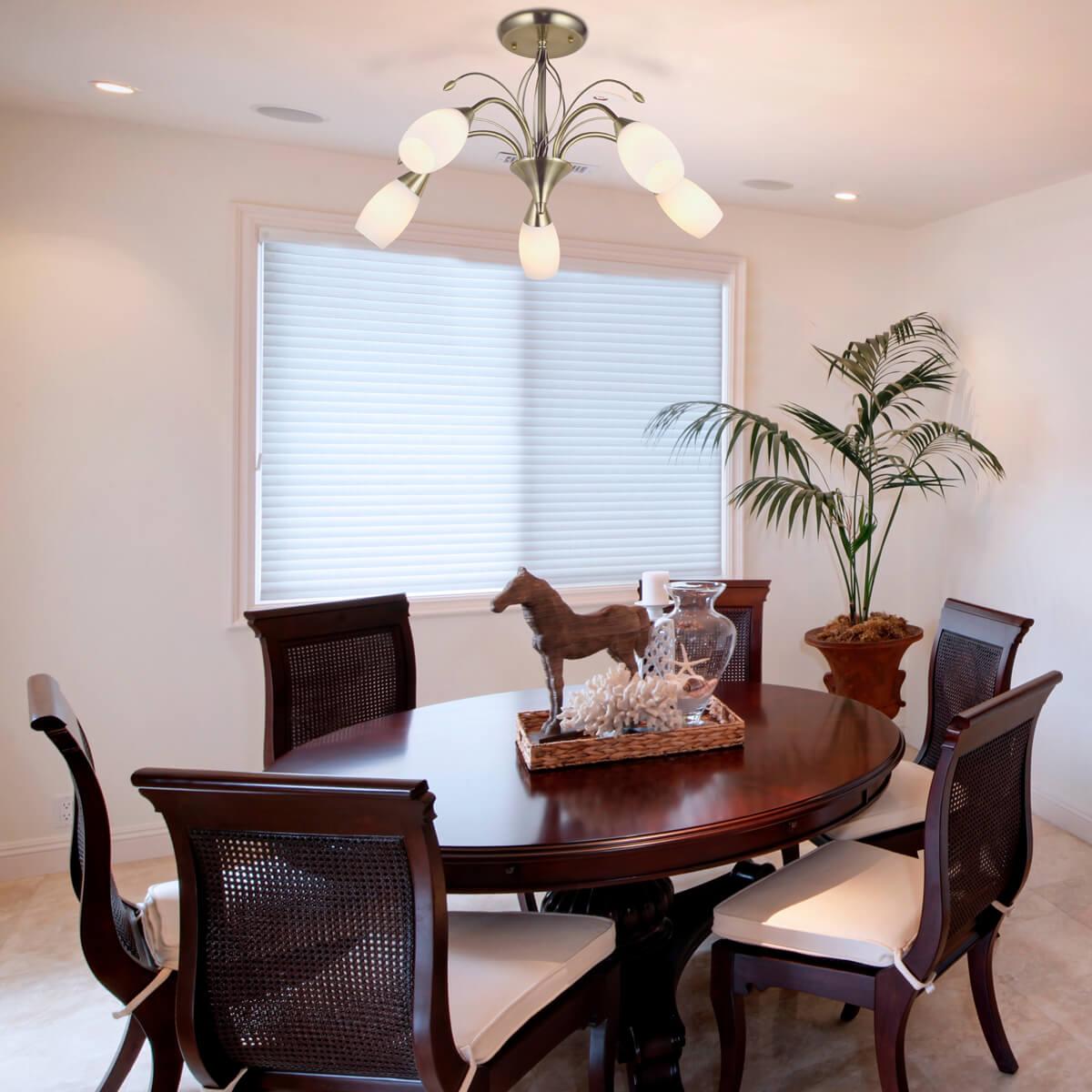 Производитель светильника рекомендует для устройства 5 ламп накаливания с цоколем E14 и мощностью 40 W, что позволит осветить помещение площадью кв.м. Габариты изделия: высота – 370 мм, диаметр – 600 мм.