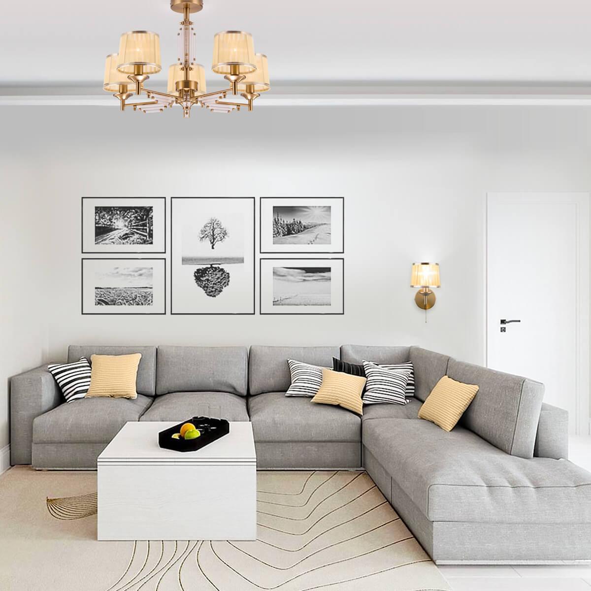 Потолочная люстра Eurosvet 60081/5 золотая бронза от Российского бренда Eurosvet из коллекции Amalfi будет удачно смотреться в спальни в стиле модерн. Светильник выполнен из ткани с плафонами в форме конуса желтого цвета.