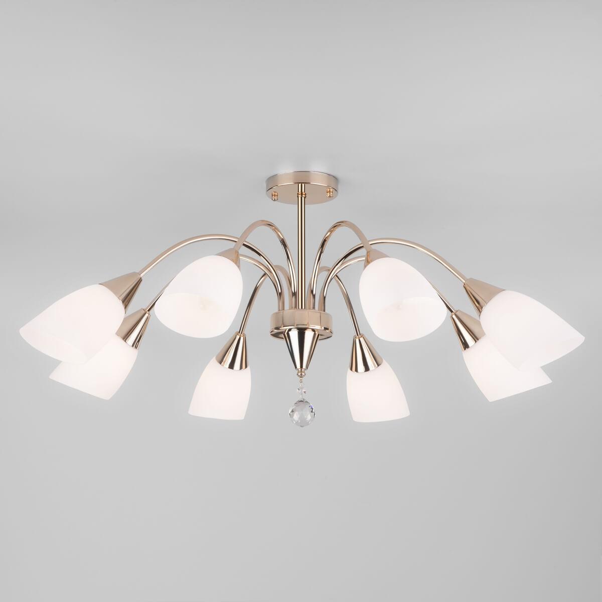 Потолочная люстра Eurosvet 30149/8 золото от Китайского бренда Eurosvet из коллекции Ellene будет удачно смотреться в гостиной в современном стиле. Светильник выполнен из стекла с плафонами в форме конуса белого цвета.